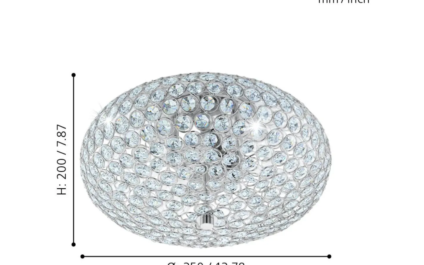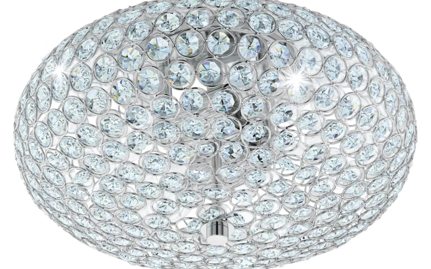 Taklampan CLEMENTE är gjord av kromfärgad metall med en oval lampskärm gjord av rader av klara kristaller. De exklusiva kristallelementen skapar ett gnistrande, högkvalitativt utseende så snart lampan tänds. Taklampan har en diameter på 35 cm och smälter elegant in i moderna interiörer och skapar den rätta stämningen i alla utrymmen, oavsett om det är i vardagsrummet, sovrummet eller hallen.