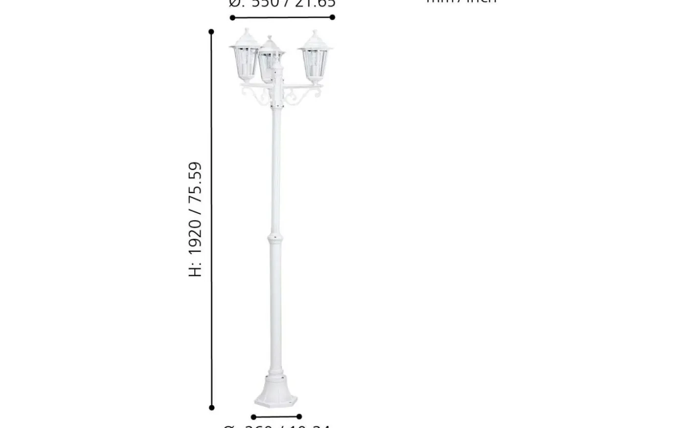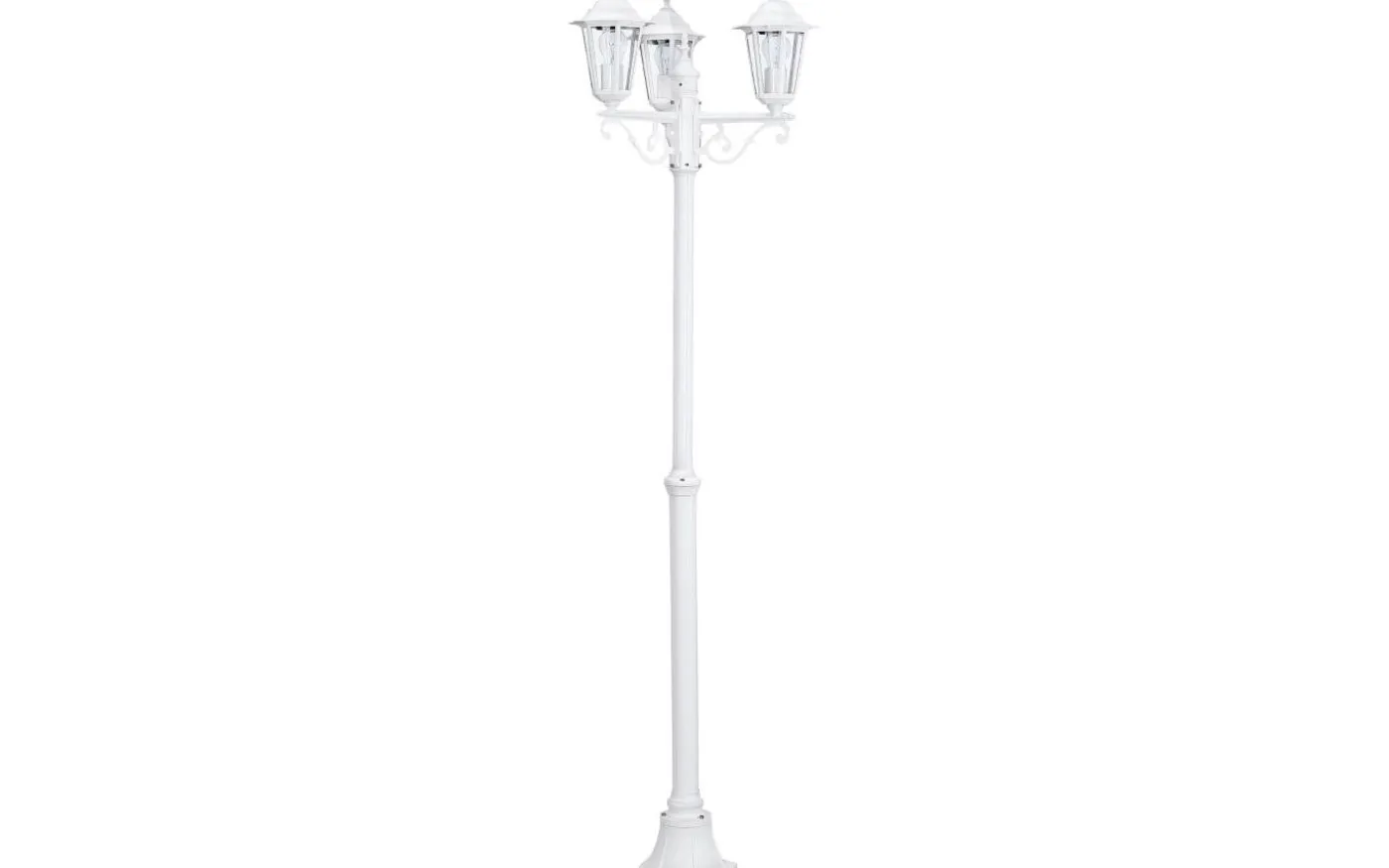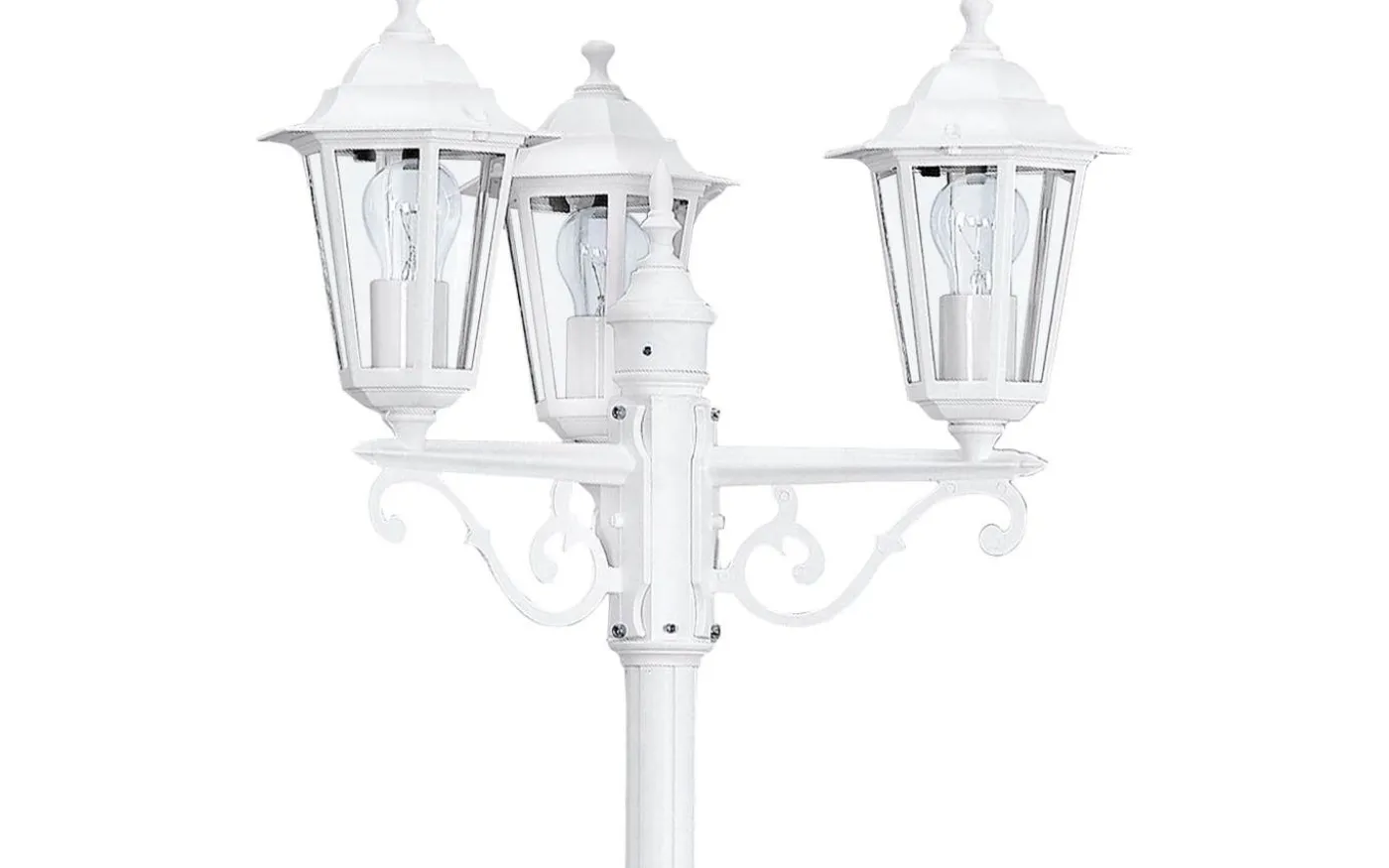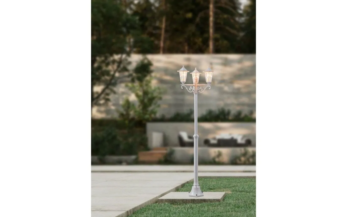 LATERNA 5-lampan i lyktstil har en kropp i vit gjuten aluminium och tre huvuden med klara glasrutor. Den yttre stolplampan är lämplig för utomhusbruk på grund av dess IP44-skydd mot sprutvatten. Med sin klassiska design smälter stolpljuset in i utomhusutrymmen med ett brett utbud av stilar och ger belysning som passar miljöer som traditionell stil eller stadsvillor i jugendstil.