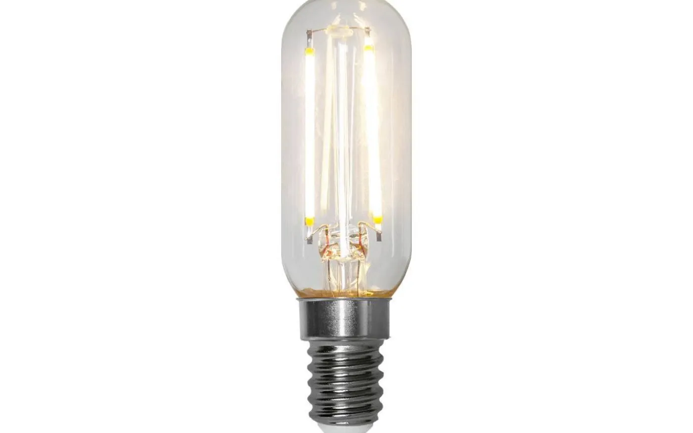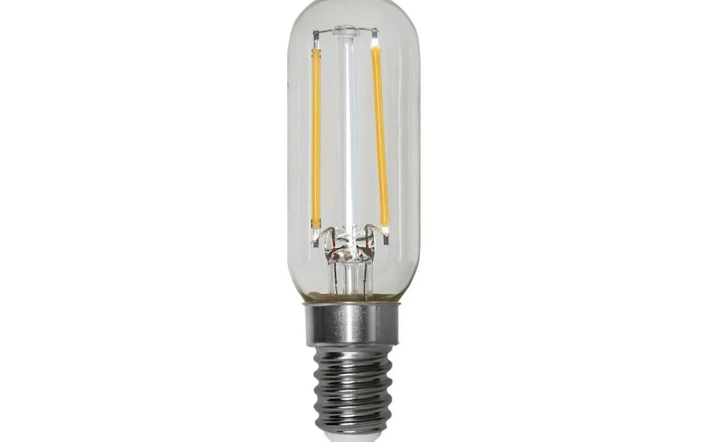 Klar filament LED-lampa med en E14-sockel. Färgtemperaturen är 2700K.