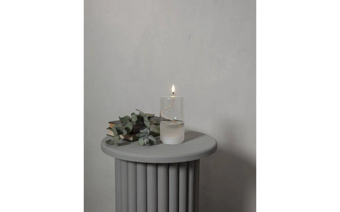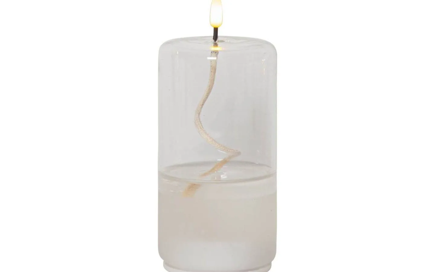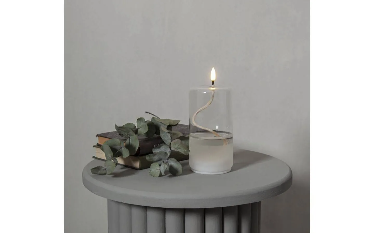 Flamme Float från Star Trading är ett ljus med glasbehållare med transparent vax inuti som ger en känsla av oljeljus där veken flyter. Det genomskinliga vaxet kan innehålla luftbubblor vilket ger ett än mer naturtroget utseende.