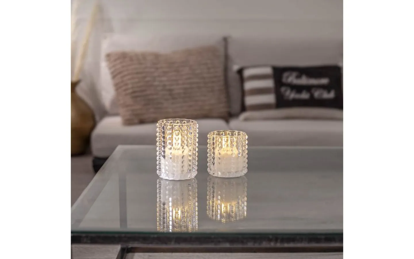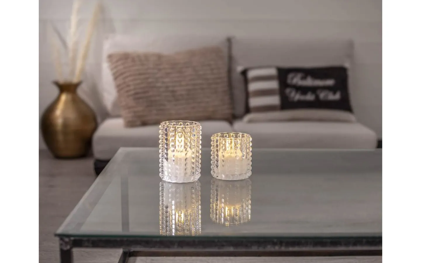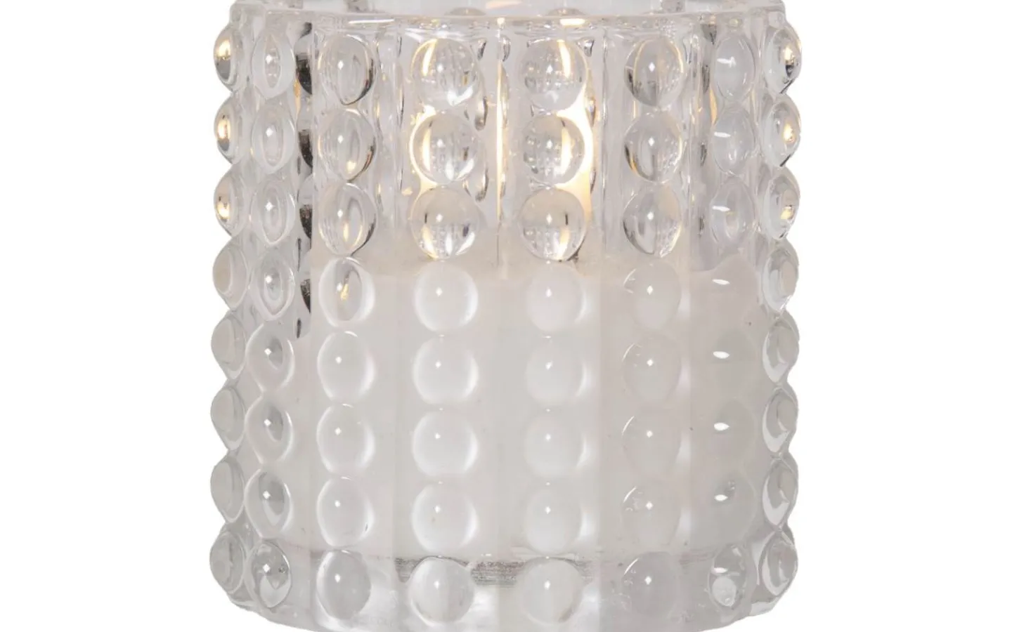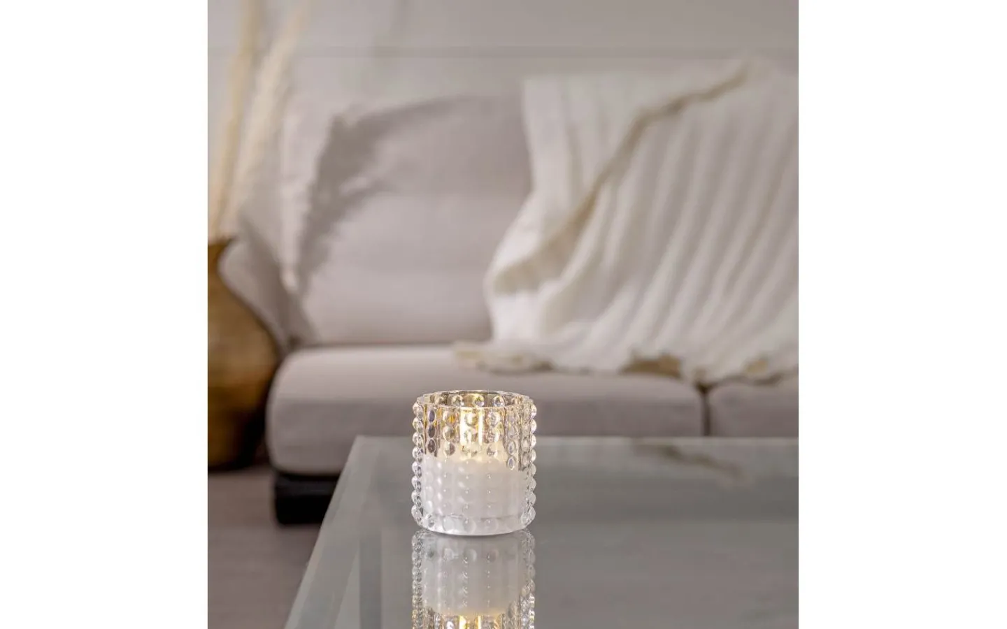 Flamme Dotty ljuslykta från Star Trading har ett glashölje med prickmönster runt vaxljuset. Detta ljus blir en vacker dekoration, både ensam som i grupp ihop med övriga ljus från vår Flamme serie.