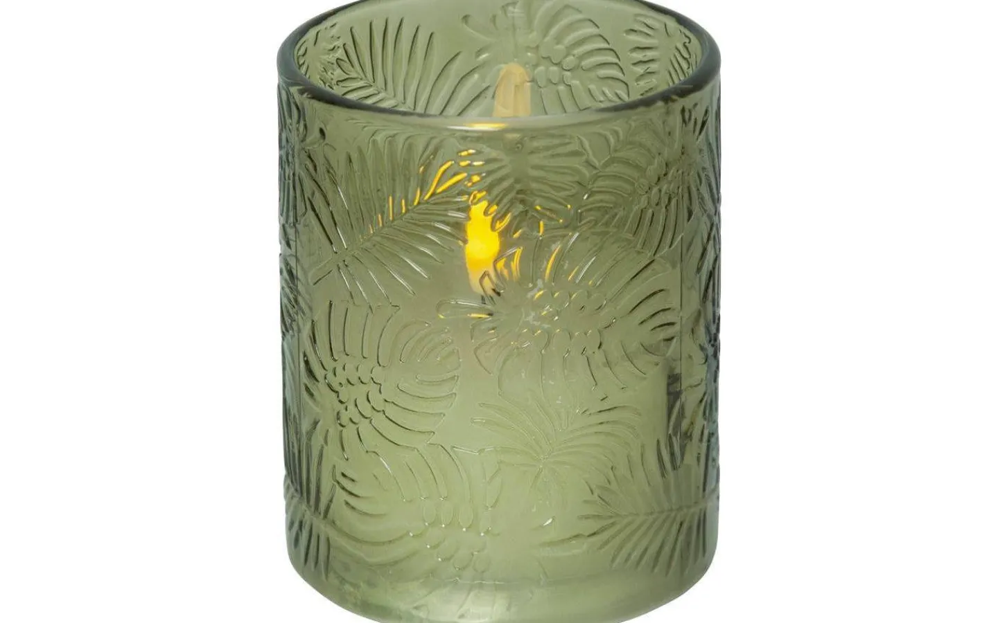 Flamme Leaf ljuslykta från Star Trading har ett grönt glas hölje med lövmönster runt vaxljuset. Detta ljus blir en vacker dekoration, både ensam som i grupp ihop med övriga ljus från vår Flamme serie.
