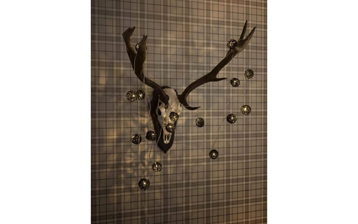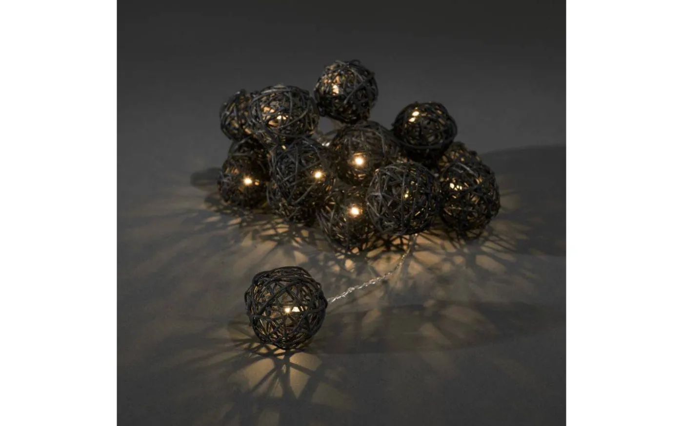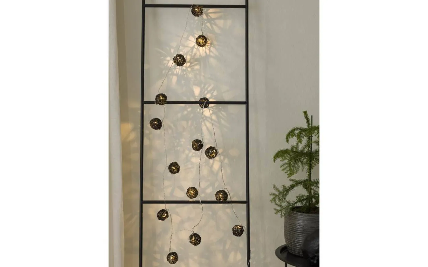 Ljusslinga fint dekorerad med 16st svarta bollar. Placera ljusslingan på ett bord eller hängandes på en vägg. Dekorativ inredning som ger ett mysigt sken i hemmet.
