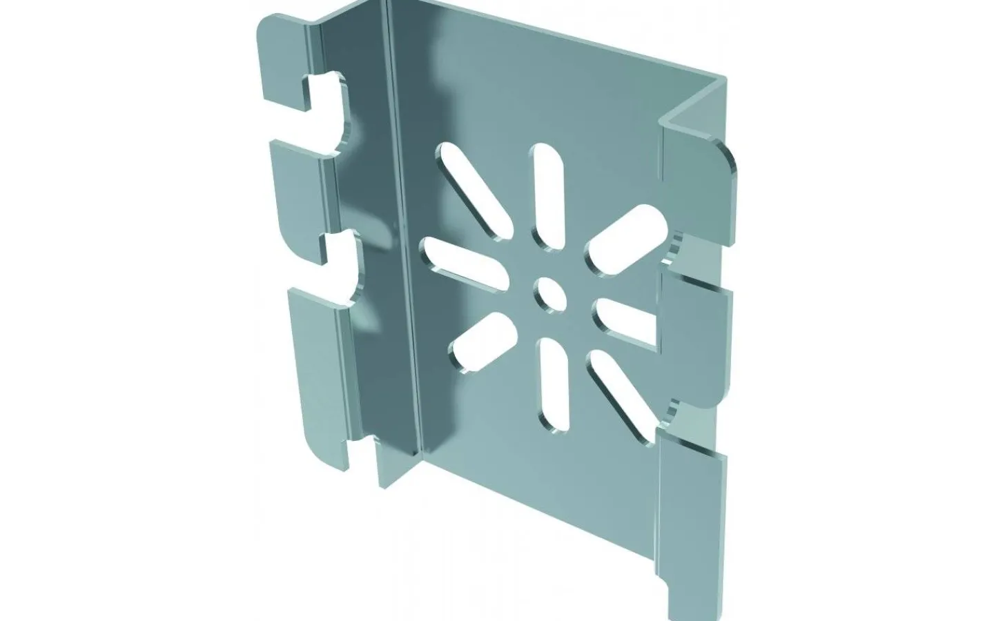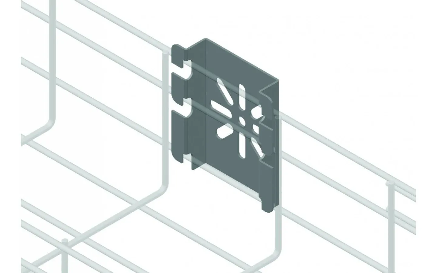 Dosplåt för mindre kopplingsdosor eller 2-vägs utanpåliggande vägguttag. Kan också användas som väggfäste för stegar upp till 100 mm bredd. Slitsade spår för montage av dosor. Passar samtliga trådstegar. Sendzimirgalvaniserad (förgalvaniserad) med korrosivitetsklass C2. Fästet låses mot trådstegen med klämmor som böjs ned.