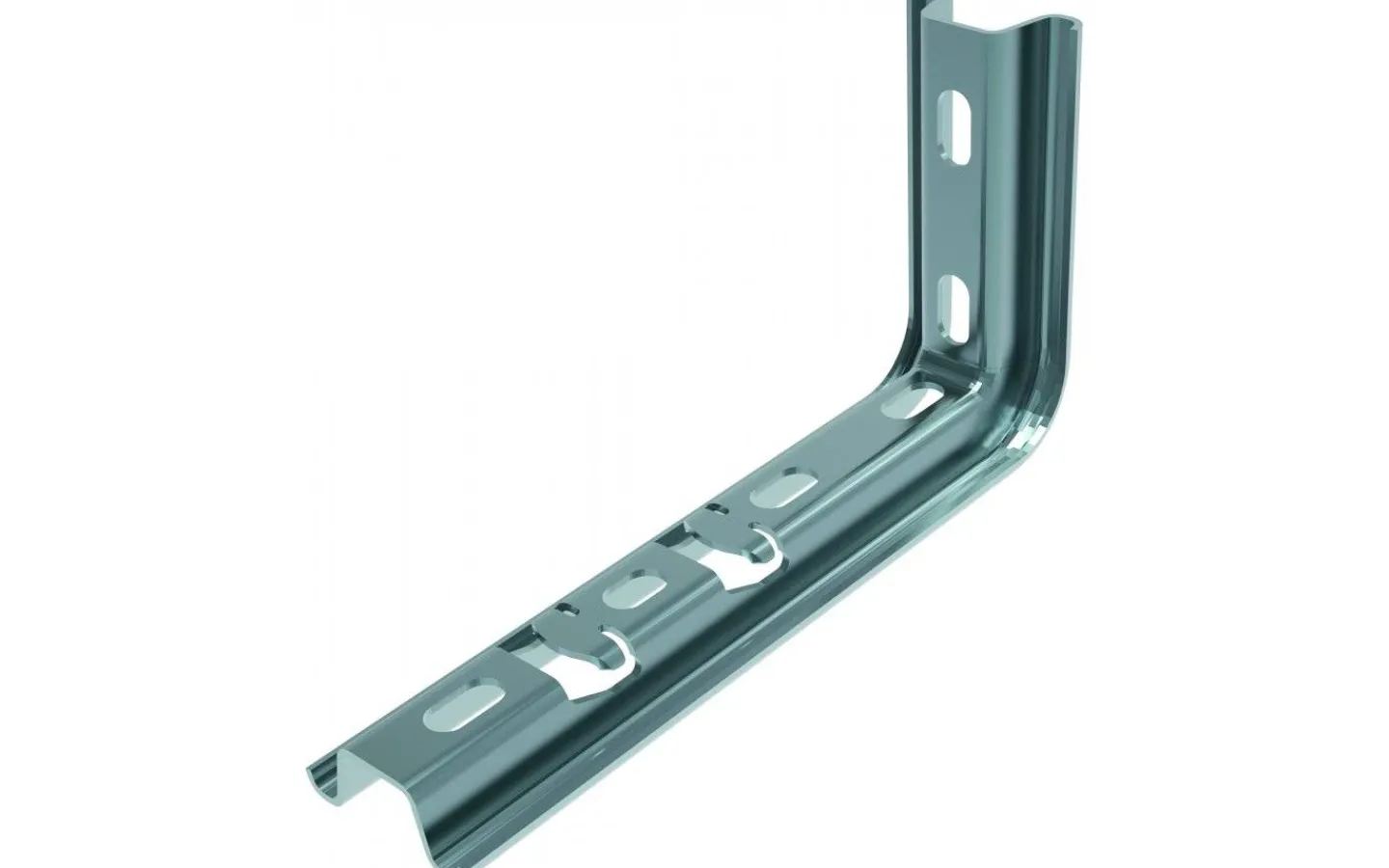 Väggkonsol för elförzinkade trådstegar. Trådstegen låses mot konsolen med klämmor som böjs ned. Kan kompletteras med ändskydd E11 337 90.