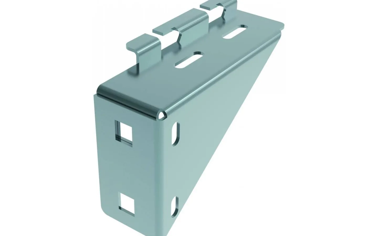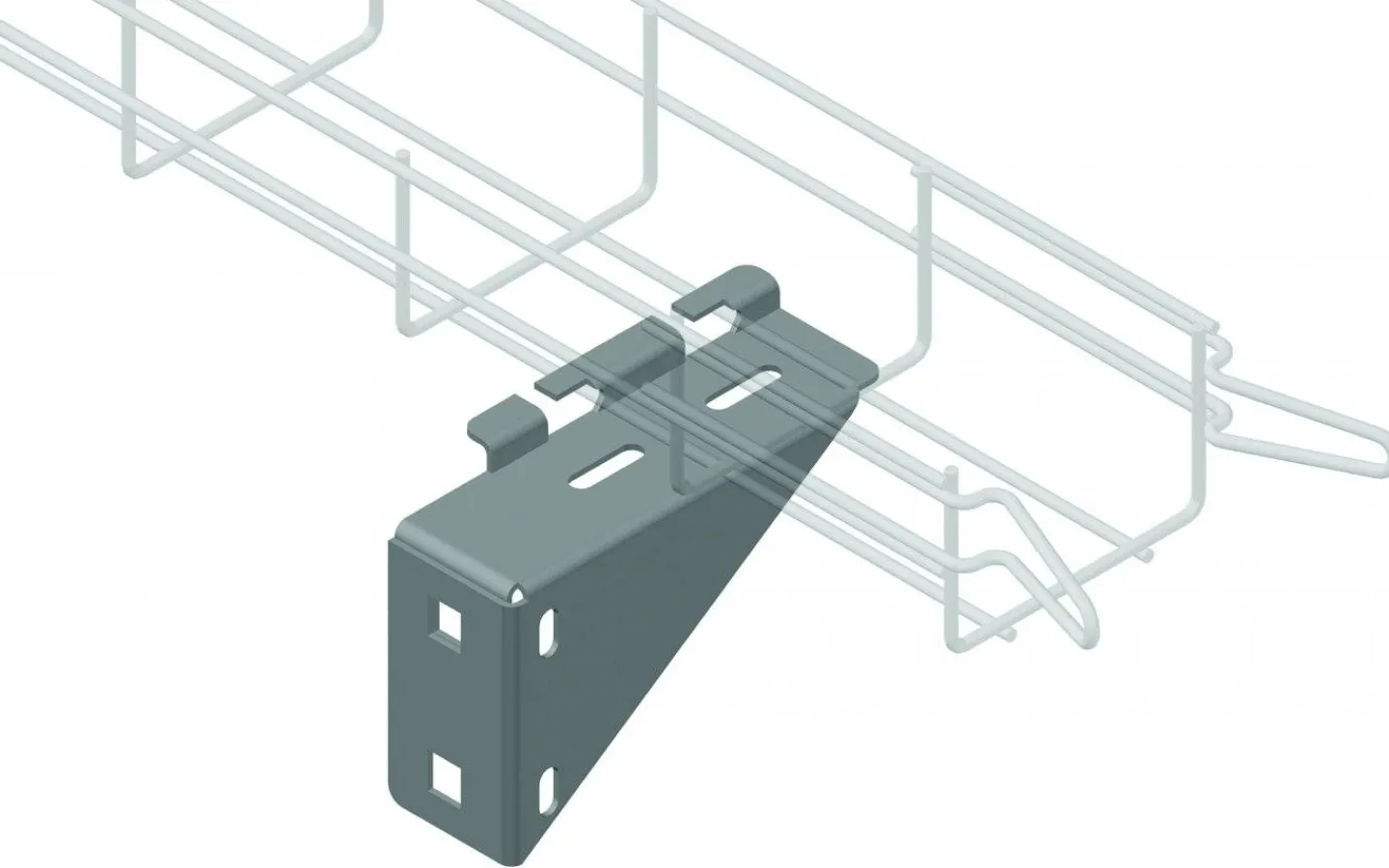 Väggkonsol för varmgalvaniserade trådstegar. Trådstegen låses mot konsolen med klämmor som böjs ned.