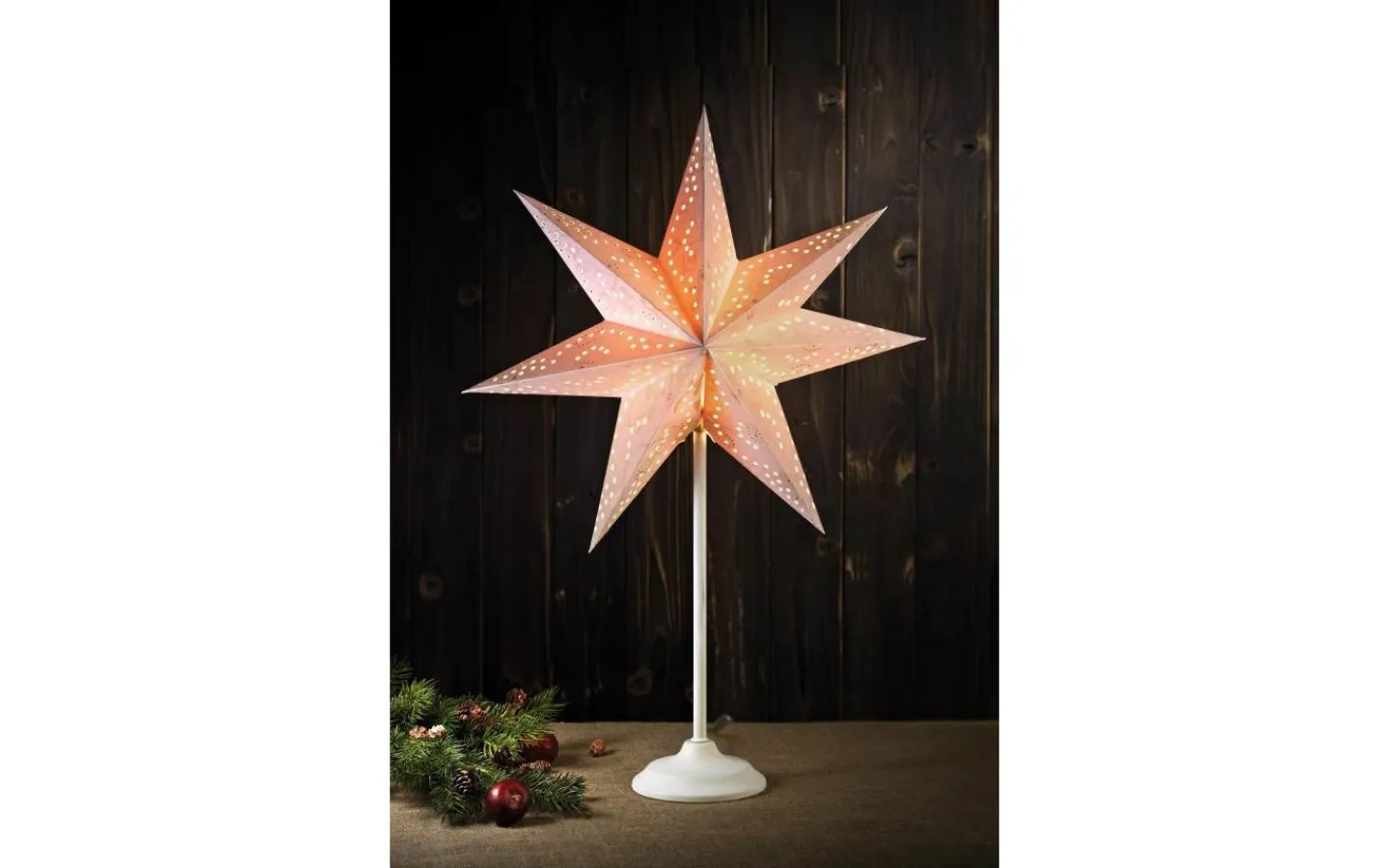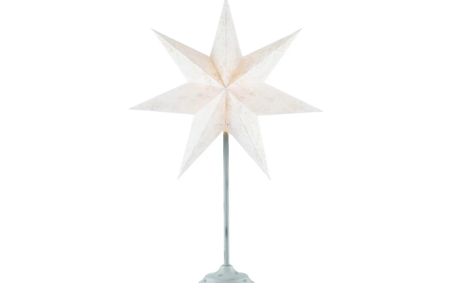 Aratorp julstjärna från Markslöjd har en stomme av silverfärgad metall och stjärnan av papp. Julstjärnan kommer komplett med en 2m kabel med strömbrytare på sladd och stickkontakt för vägguttag.