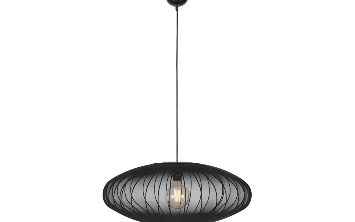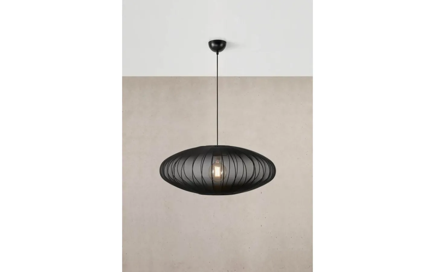 Stor, oval taklampa med svart textilskärm som släpper igenom ett behagligt allmänljus. Lampan har en diameter om 75cm och totalhöjd om 30cm. Passar fint i vardagsrummet eller sovrummet, gruppera gärna med flera former. Finns i flera former och även i vitt.