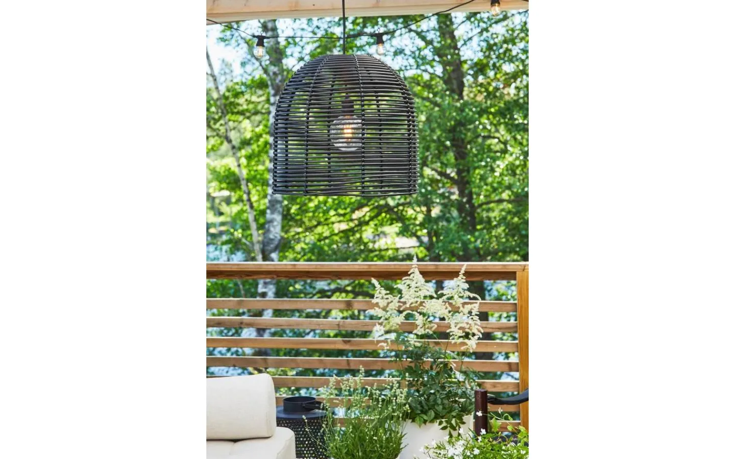 Skärmen är gjord i svart plast och avger en modern känsla av rotting som passar perfekt över matbordet eller över loungegruppen. Denna taklampa har inbyggd ljuskälla i LED av högsta kvalitet, som har låg energiförbrukning och väldigt lång livslängd. Ljuskällan avger ett dekorativt varmvitt ljussken och hjälper dig att skapa en mysig stämning på din uteplats!
