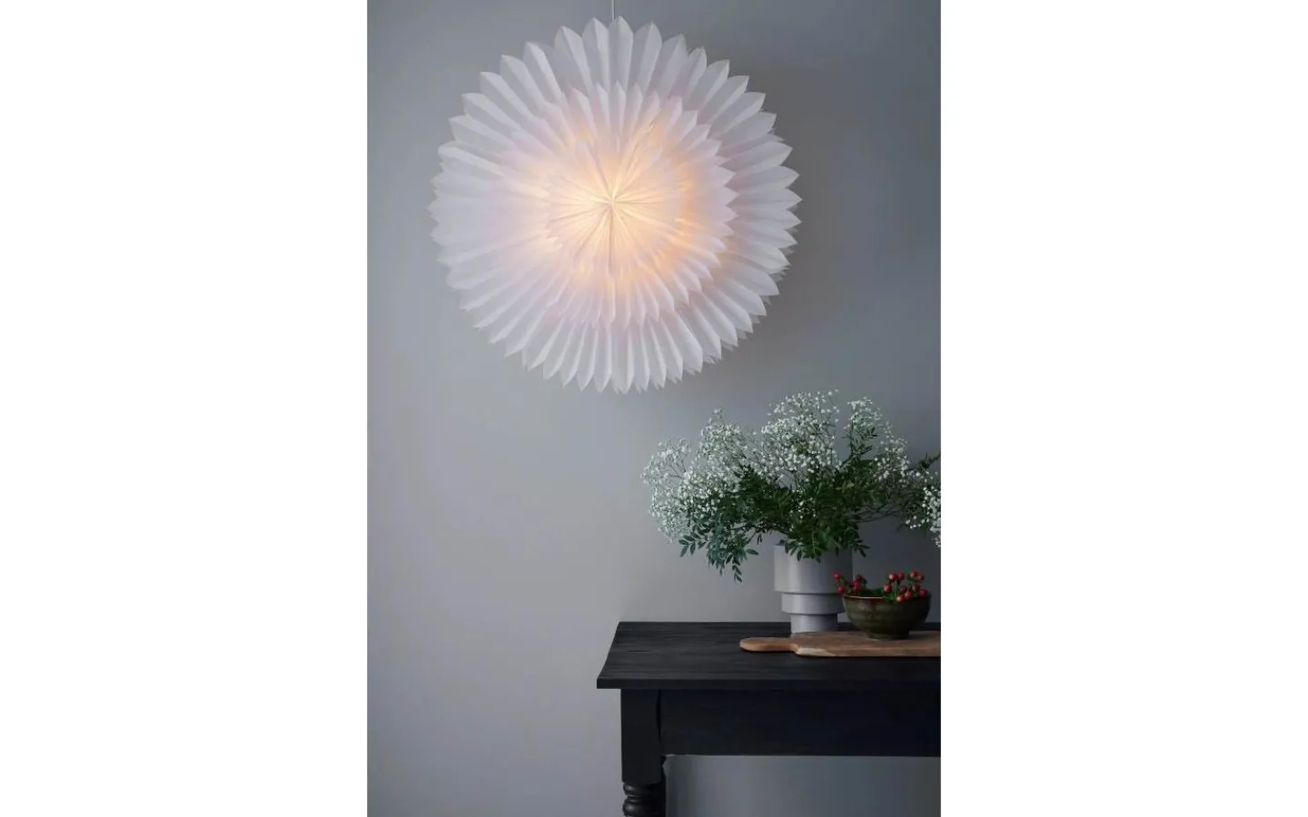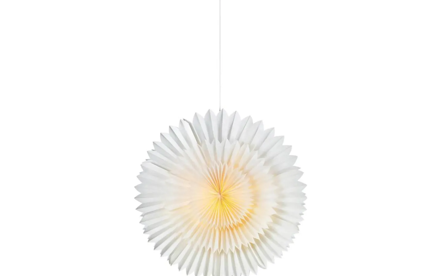 Med den här julstjärnan får du garanterat ett snyggt blickfång hemma. Pappersstjärnan Solina mäter 75cm i diameter och passar därför utmärkt i ett stort fönster. Tekniskt: Lampan kräver en glödlampa med liten sockel (E14) om max 6W eller motsvarande i LED, ingår ej. 3,5m vit sladd med strömbrytare.