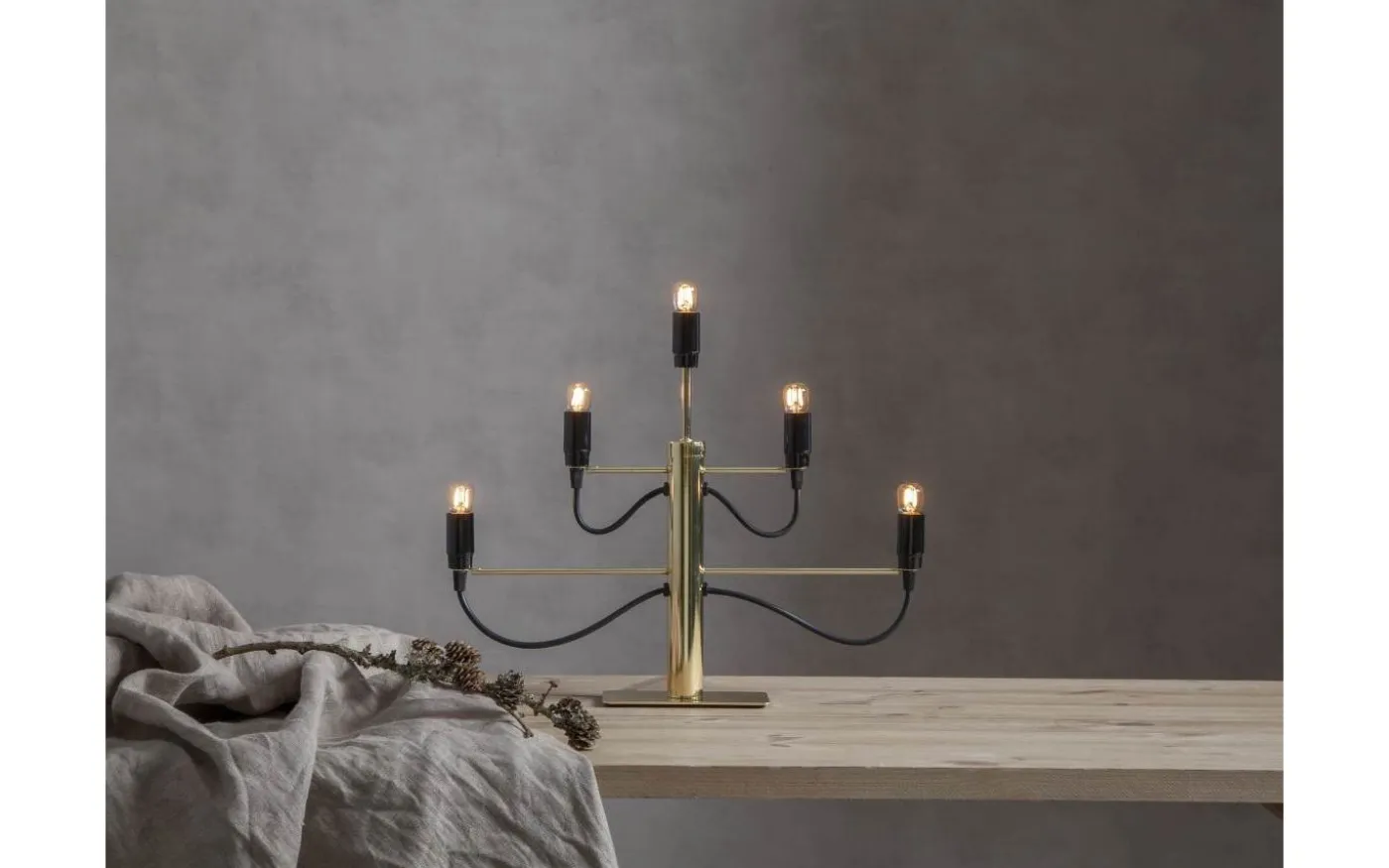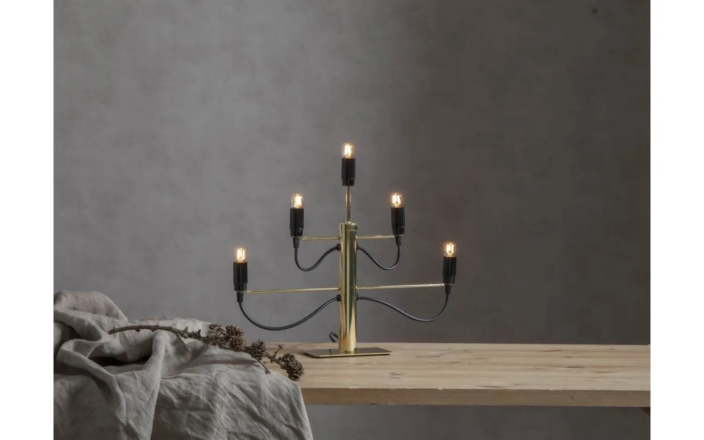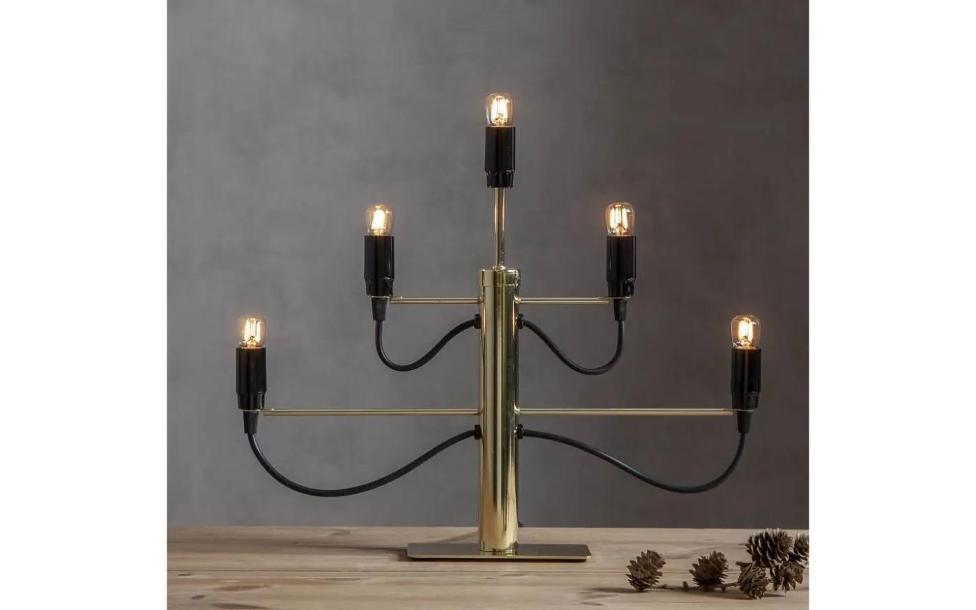 Vackra Milano adventsljusstake från Star Trading är en modern och stilren ljusstake i mässingsfärgad metall med svarta lamphållare och synliga kablar.