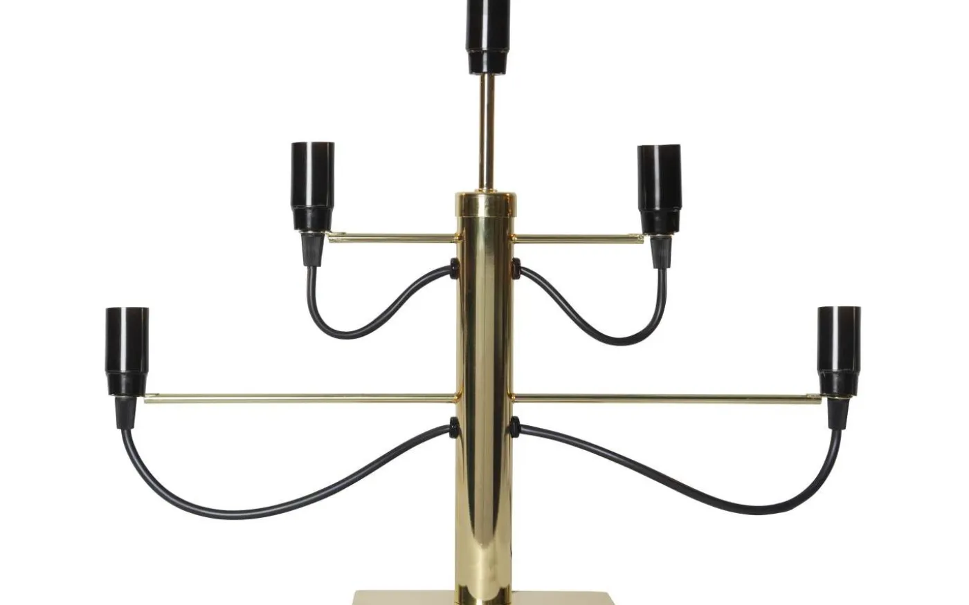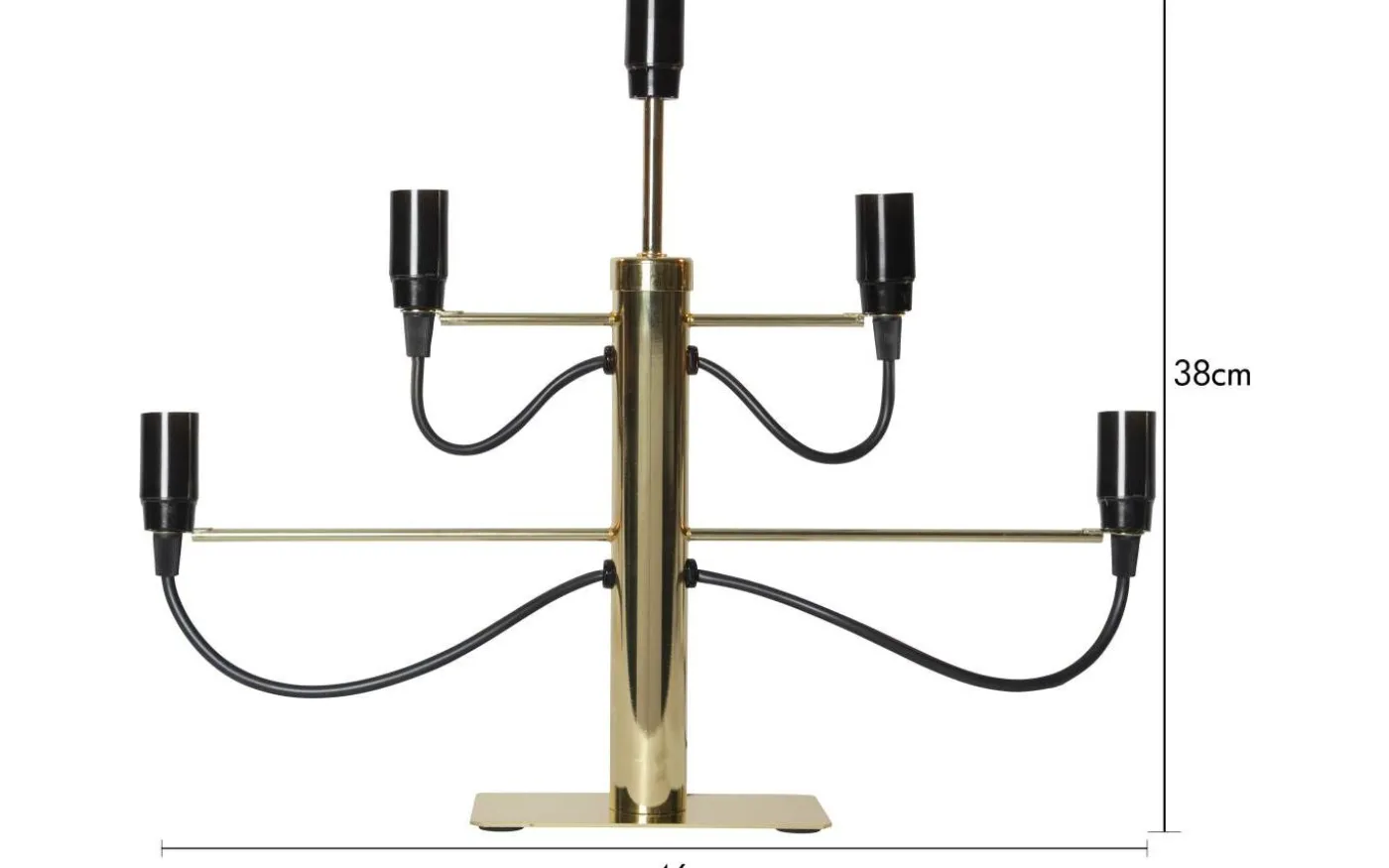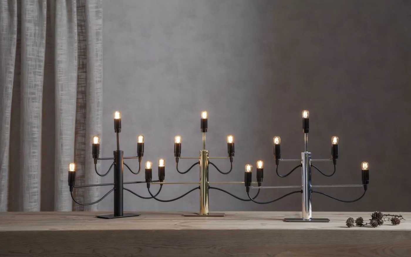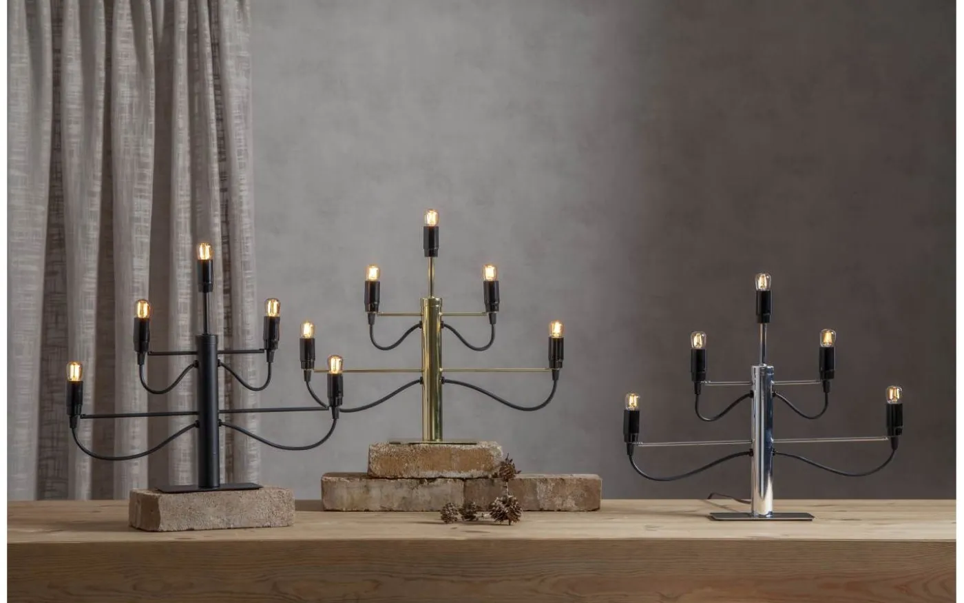 Vackra Milano adventsljusstake från Star Trading är en modern och stilren ljusstake i mässingsfärgad metall med svarta lamphållare och synliga kablar.
