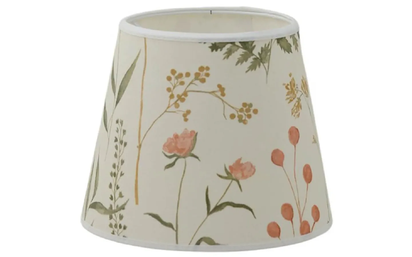 Hazel är en romantisk lampskärm med ett mjukt blommönster i dova, naturliga toner som ger ett stillsamt och ombonat uttryck. De handmålade känslan i motiven gör skärmen dekorativ även i släckt läge, och den neutrala bottenfärgen gör att den enkelt passar in i många olika inredningsstilar. Perfekt för fönsterlampor, sidobord eller sovrum där man vill addera ett mjukt ljus och ett levande textilt inslag.