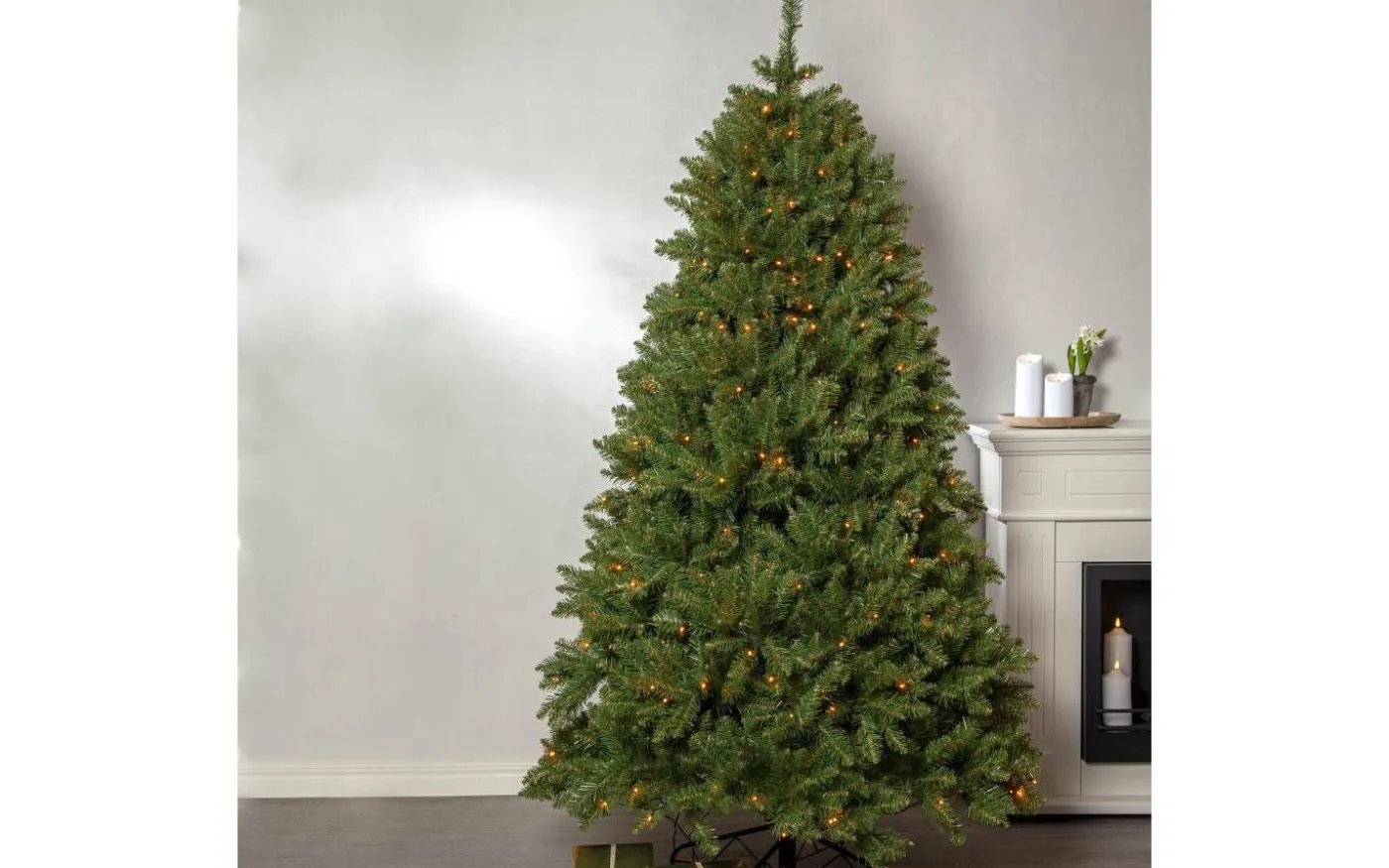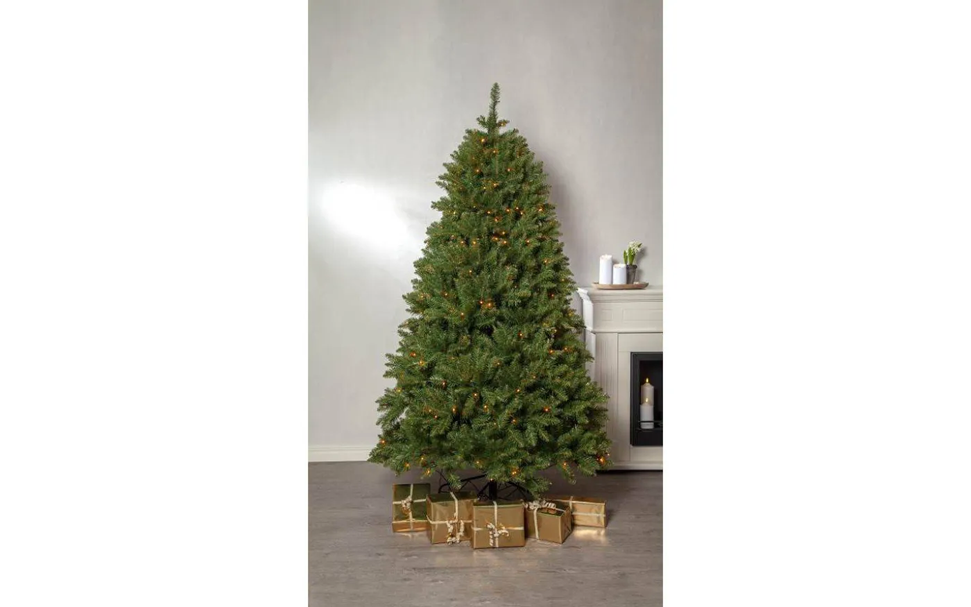 Grenarna på denna julgran är permanent fastsatta vid stammen i gångjärnet och fälls ned när man monterar granen. Narvik julgran är tät och fyllig och har 300 LED-ljuskällor som avger ett gyllene varmvitt sken.