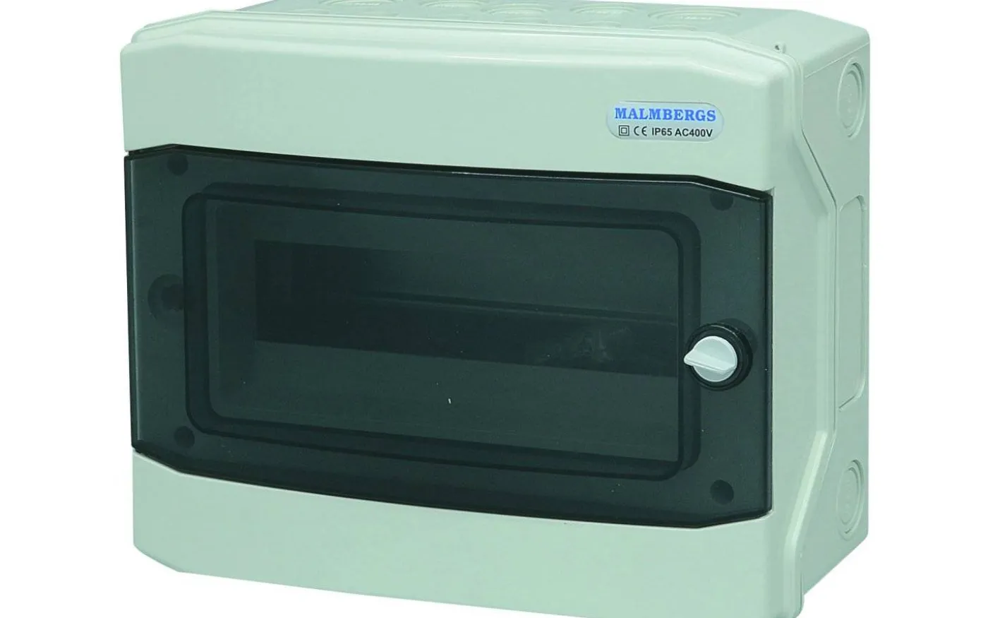 Halogenfri normkapsling tillverkad i UV-beständig, slagtålig och självslocknande ASA-plast 650°C. Bakstycket är heltäckande och har utbrytningshål för inkommande kablar och rör. Levereras komplett med rökfärgad dörr och noll- och skyddsledarskenor av polyamid 960°C. 6 modulers täcklock medföljer.