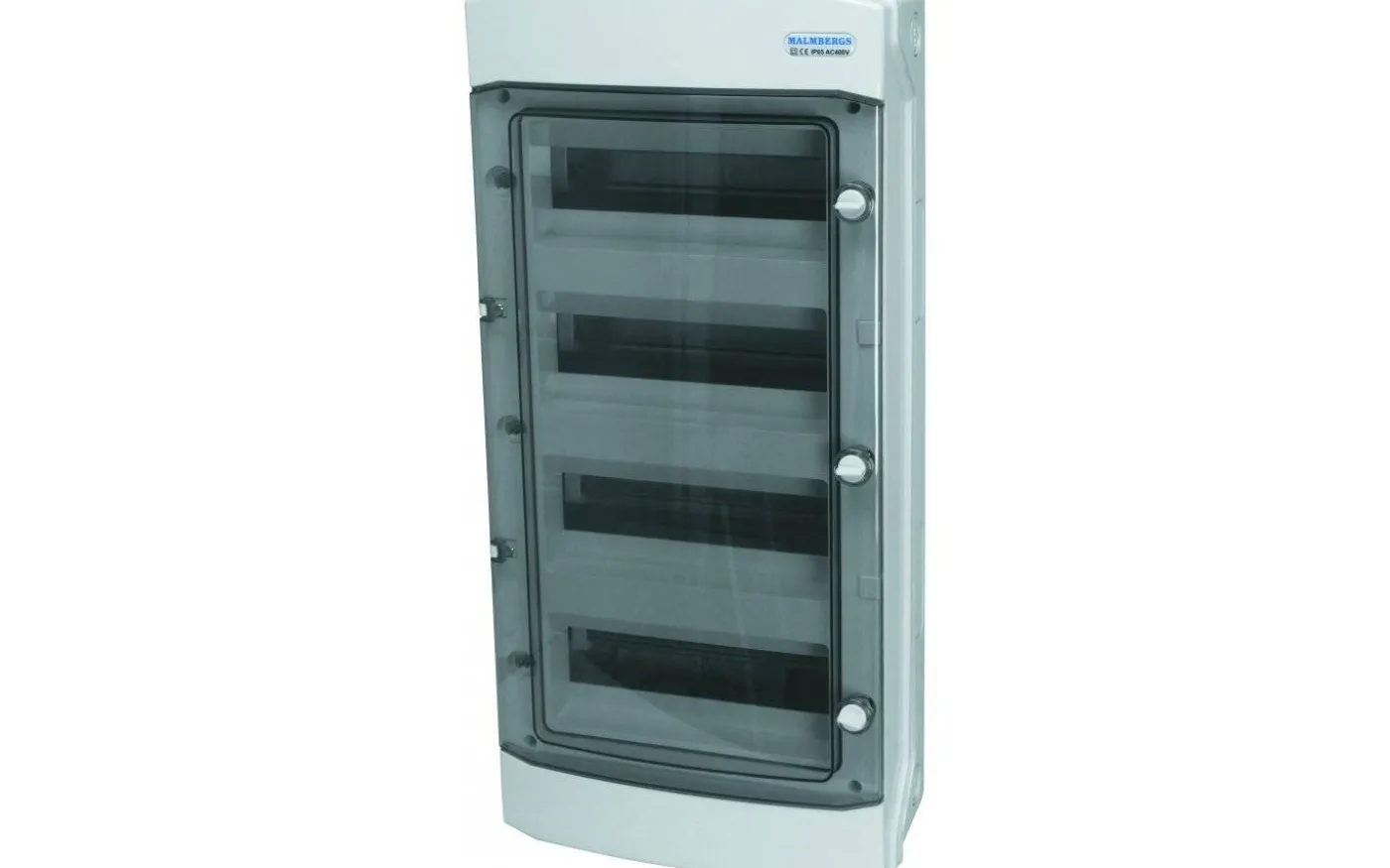 Halogenfri normkapsling tillverkad i UV-beständig, slagtålig och självslocknande ASA-plast 650°C. Bakstycket är heltäckande och har utbrytningshål för inkommande kablar och rör. Levereras komplett med rökfärgad dörr och noll- och skyddsledarskenor av polyamid 960°C. 6 modulers täcklock medföljer.