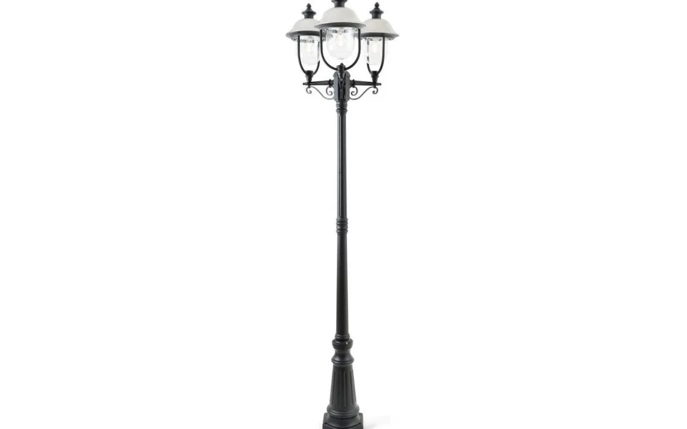 Stolplyktan är 2,2 meter hög, gjord i rostfritt stål och har en en vacker trearmad lykta med klarglas.