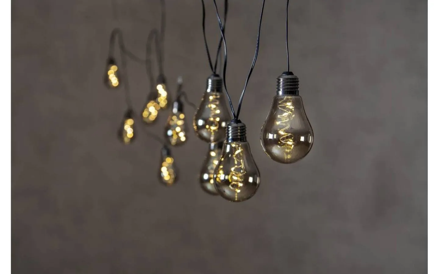 Glow är en fin ljusslinga med 10 stycken rökfärgade ljuskällor i LED. Inuti varje lampa finns en tunn, spiralformad ljusslinga med små, fina LED-lampor som avger ett dekorativt varmvitt ljussken. Denna ljusslinga är perfekt att dekorera med, både till vardags och till fest, för att få en riktigt mysig stämning. Glow ljusslinga går också bra att använda utomhus men under tak, då den är vattentät men inte rostfri. Passar även bra som nattbelysning i ett barnrum.