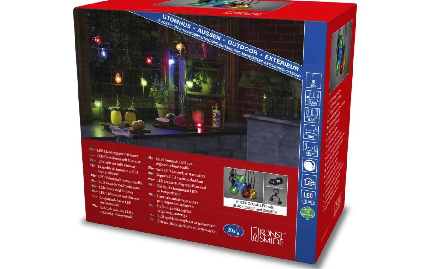 Denna festliga partyslinga från Konstsmide är 9,5m lång med 20st färgade lampor. Slingan är IP44 klassad vilket innebär att denna går att hänga utomhus. Perfekt att dekorera med till årets alla festligheter!