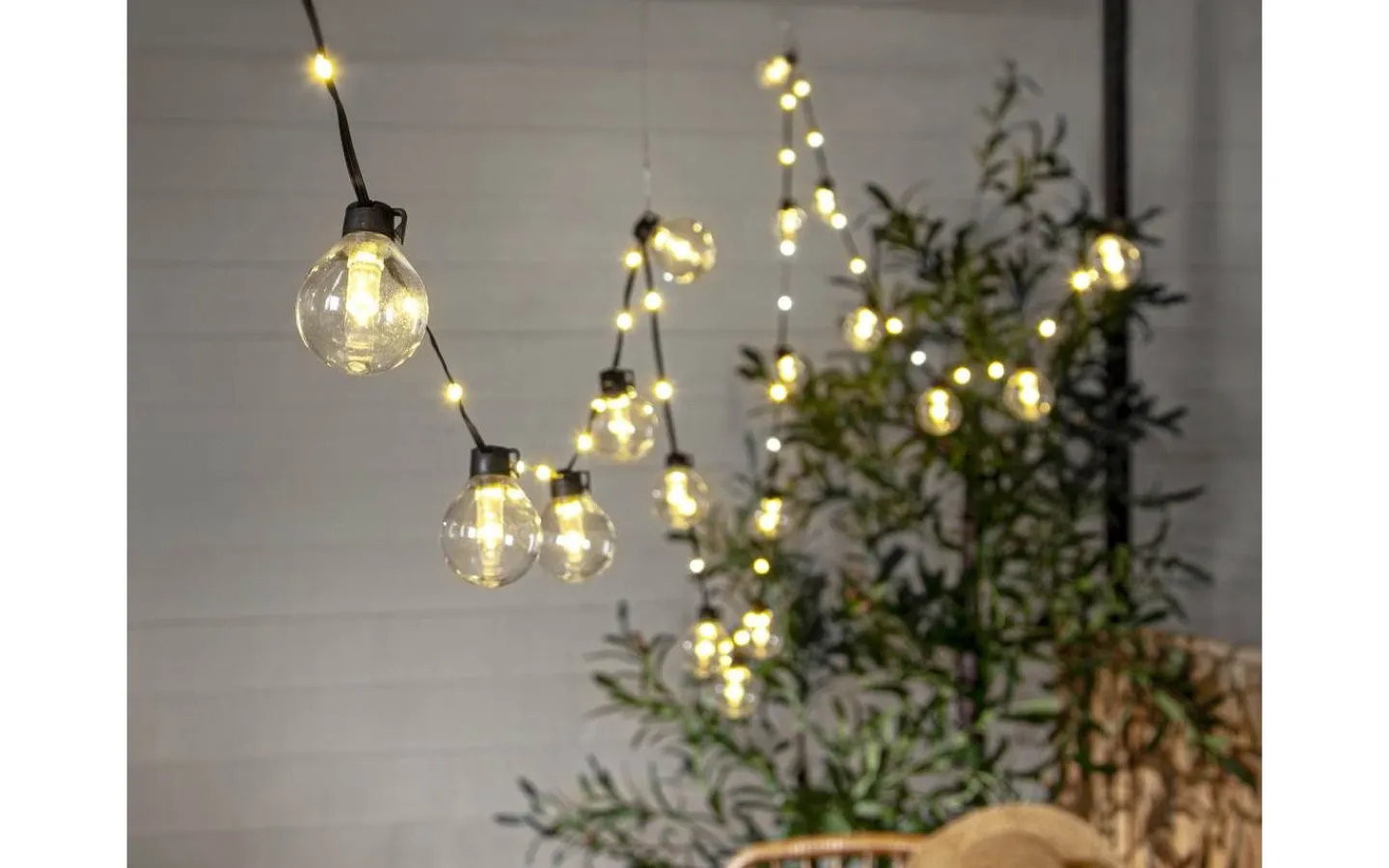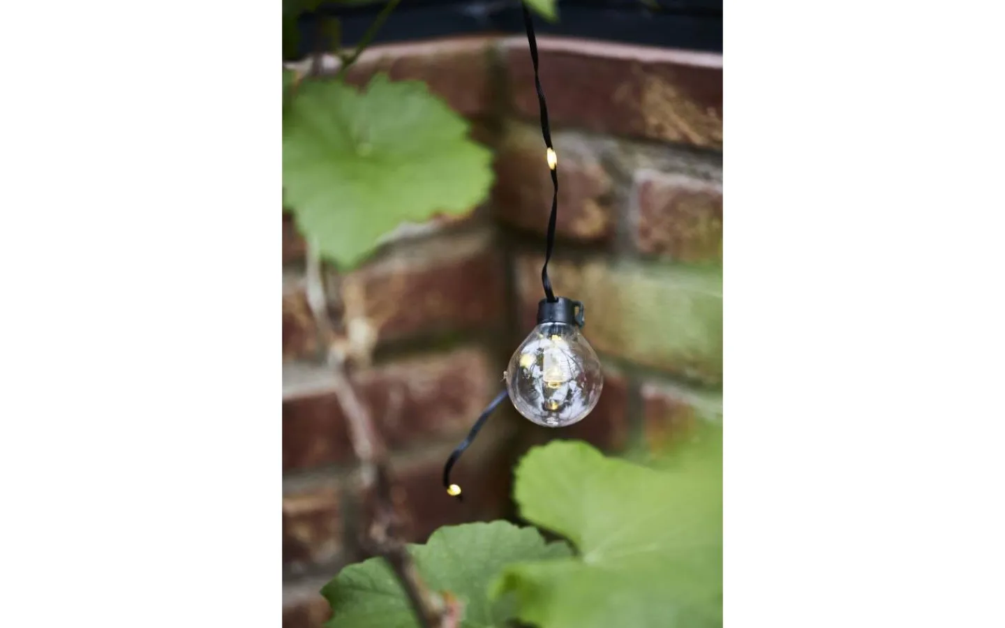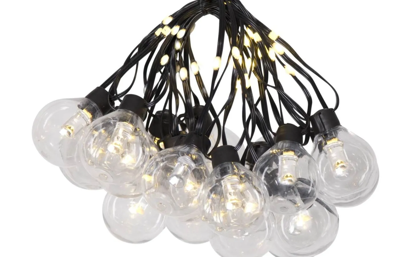 Ljusslinga för utomhusbruk med 20 st klara glober som är 4 cm i diameter, mellan varje glob finns ytterligare 2 ljuspunkter på kabeln, samtliga ljuspunkter med varmvitt sken. Passar både till vardags och festliga tillfällen.