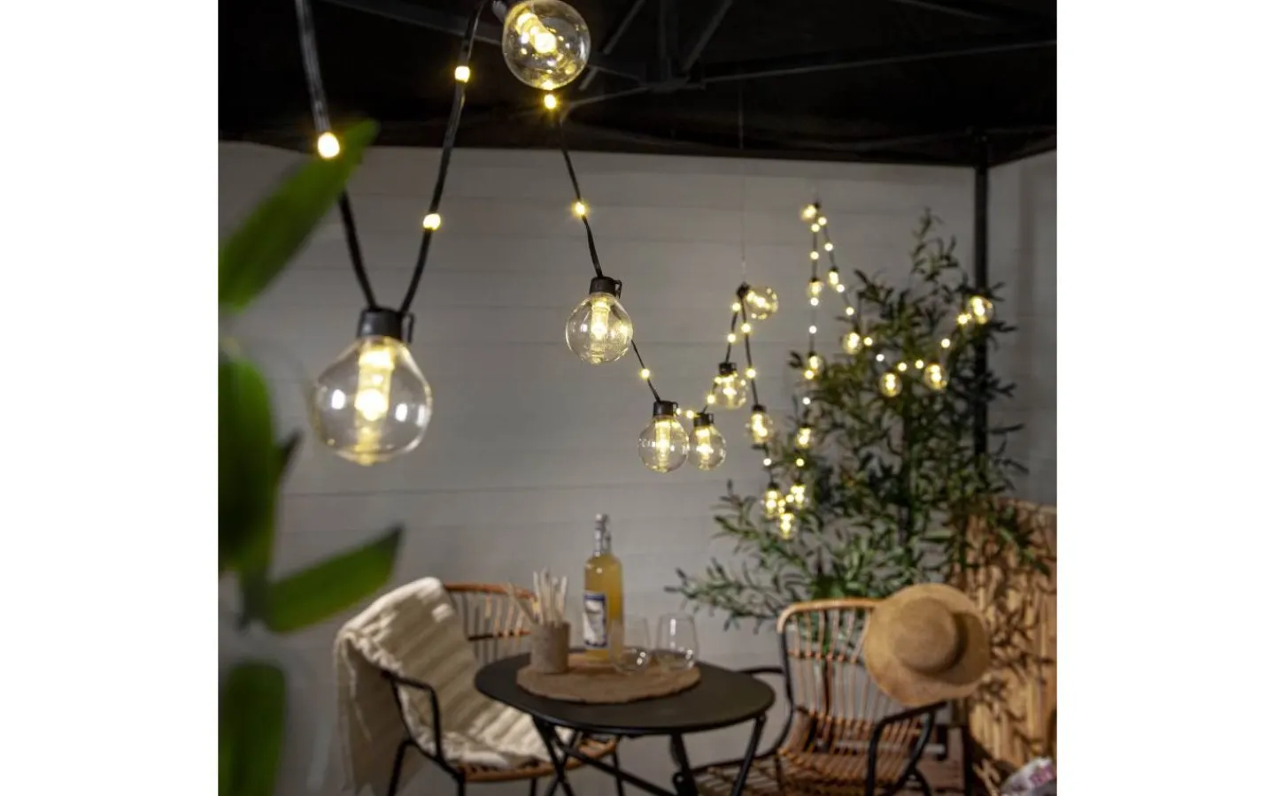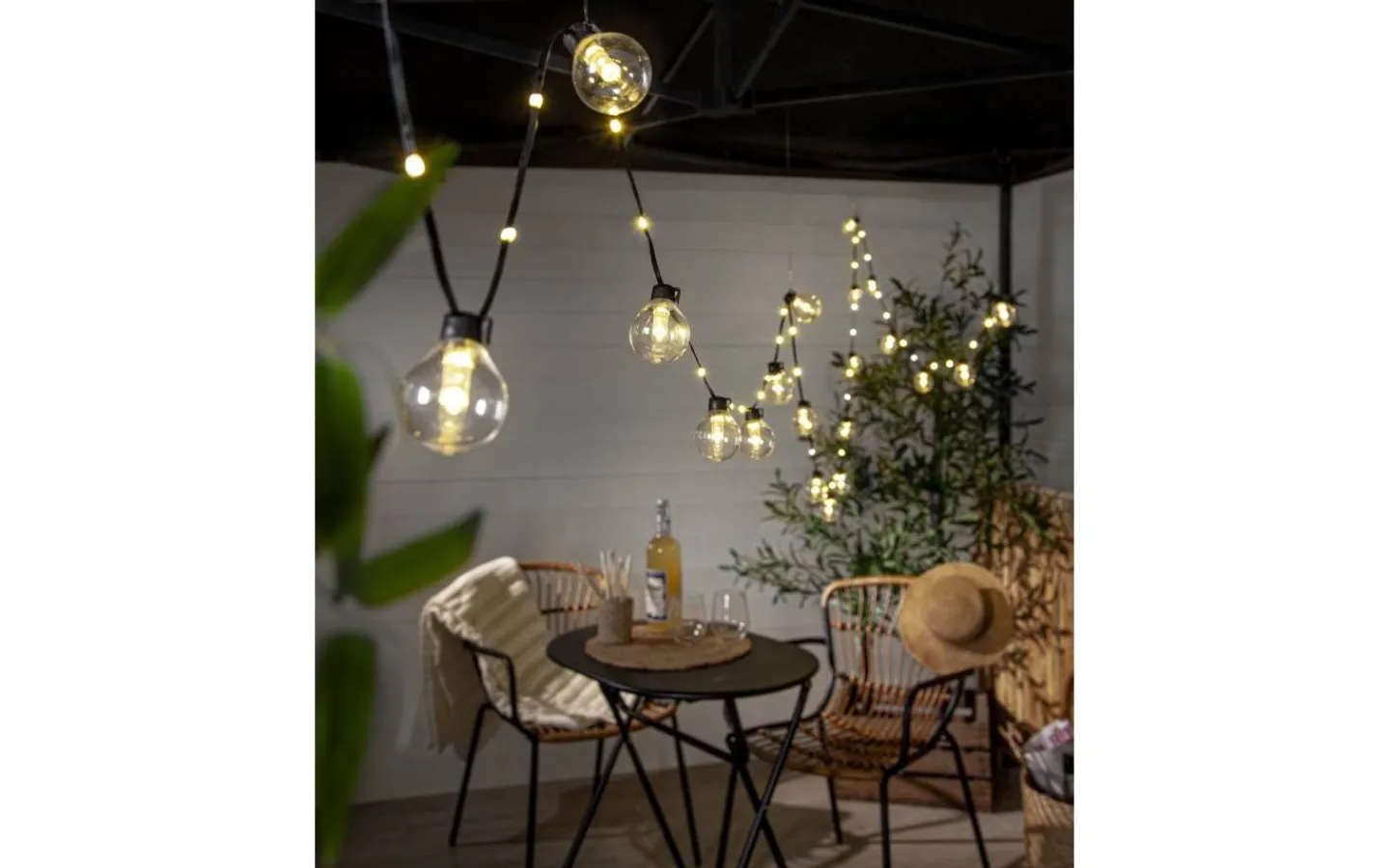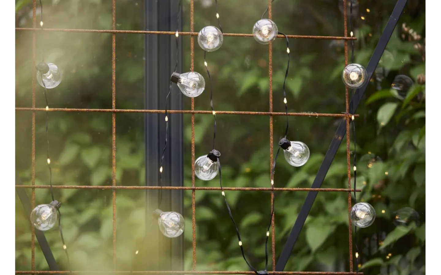 Ljusslinga för utomhusbruk med 20 st klara glober som är 4 cm i diameter, mellan varje glob finns ytterligare 2 ljuspunkter på kabeln, samtliga ljuspunkter med varmvitt sken. Passar både till vardags och festliga tillfällen.