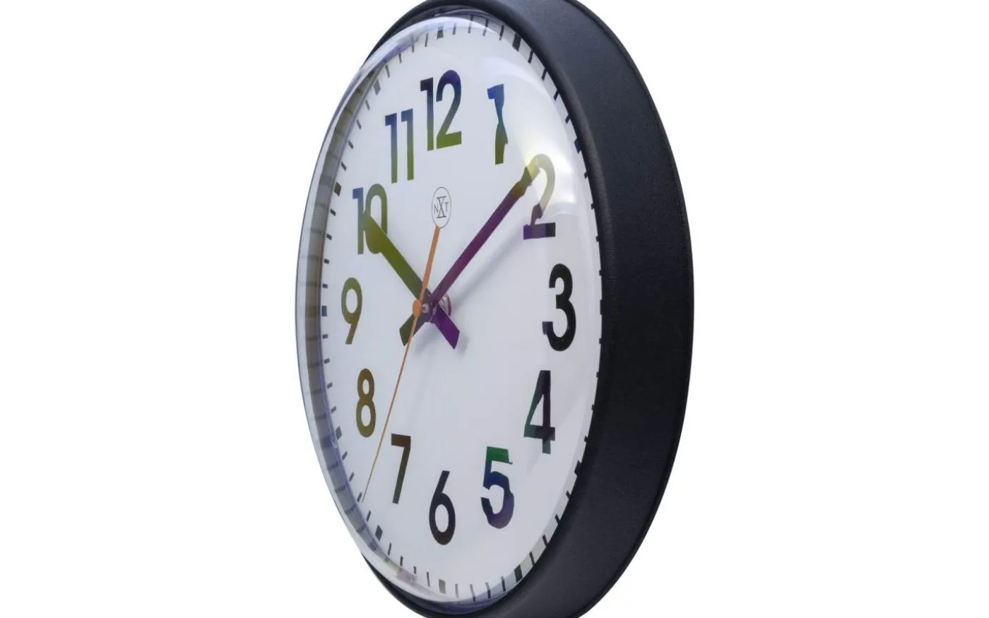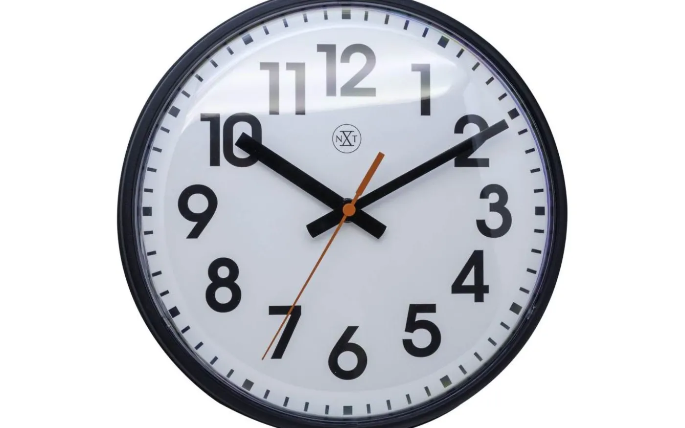 Peter från NeXtime är en klassisk väggklocka med vit urtavla med svarta stora siffror och en ram i svart plast.