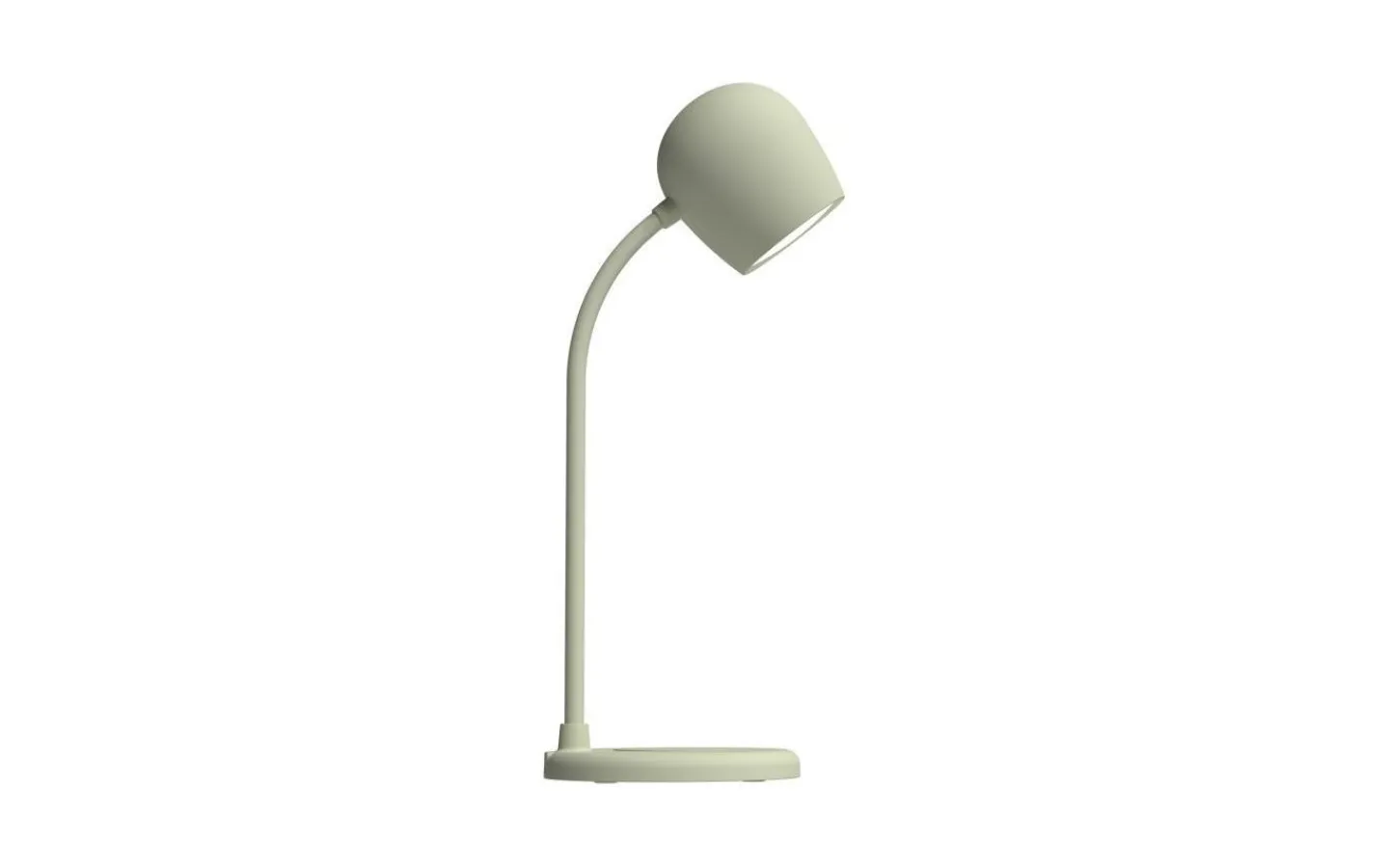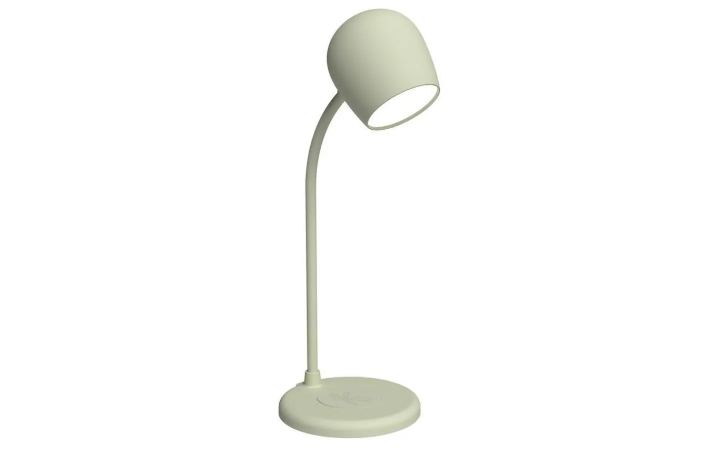 LED-lampa med trådlös laddare (Qi 10W) och högtalare 3W, Bluetooth 5.1 Dimbar 3 nivåer. Inbyggd mikrofon. Vattenresistent IPX4. Mått: Ø12 x H32 cm. Material: 100% återvunnen GRS-plast/Järn/Silikon. Laddningskabel: USB-C (Ingår). Färg: Dusty Olive