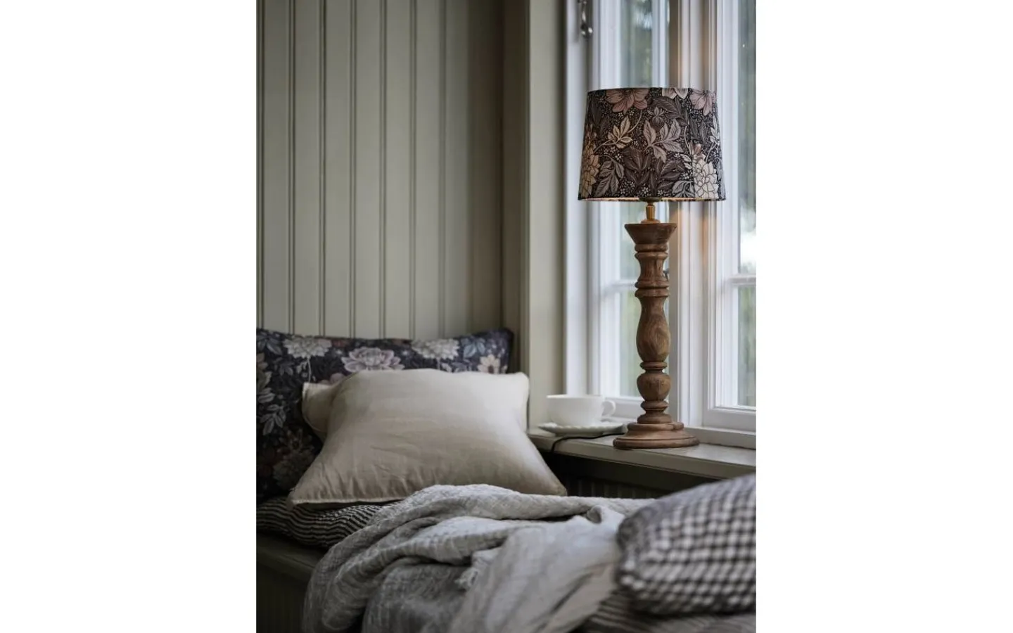 Sofia lampskärm från PR Home med mönstret Dahlia Garden som är ett handmålat mönster av designern Jenny Hahne Gadd för Boråstapeter. Lampskärmen har E27-ringfäste och tyget är tillverkad i 100% återvunnen polyester.