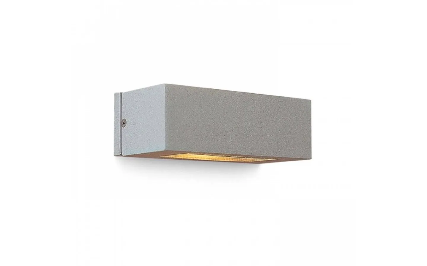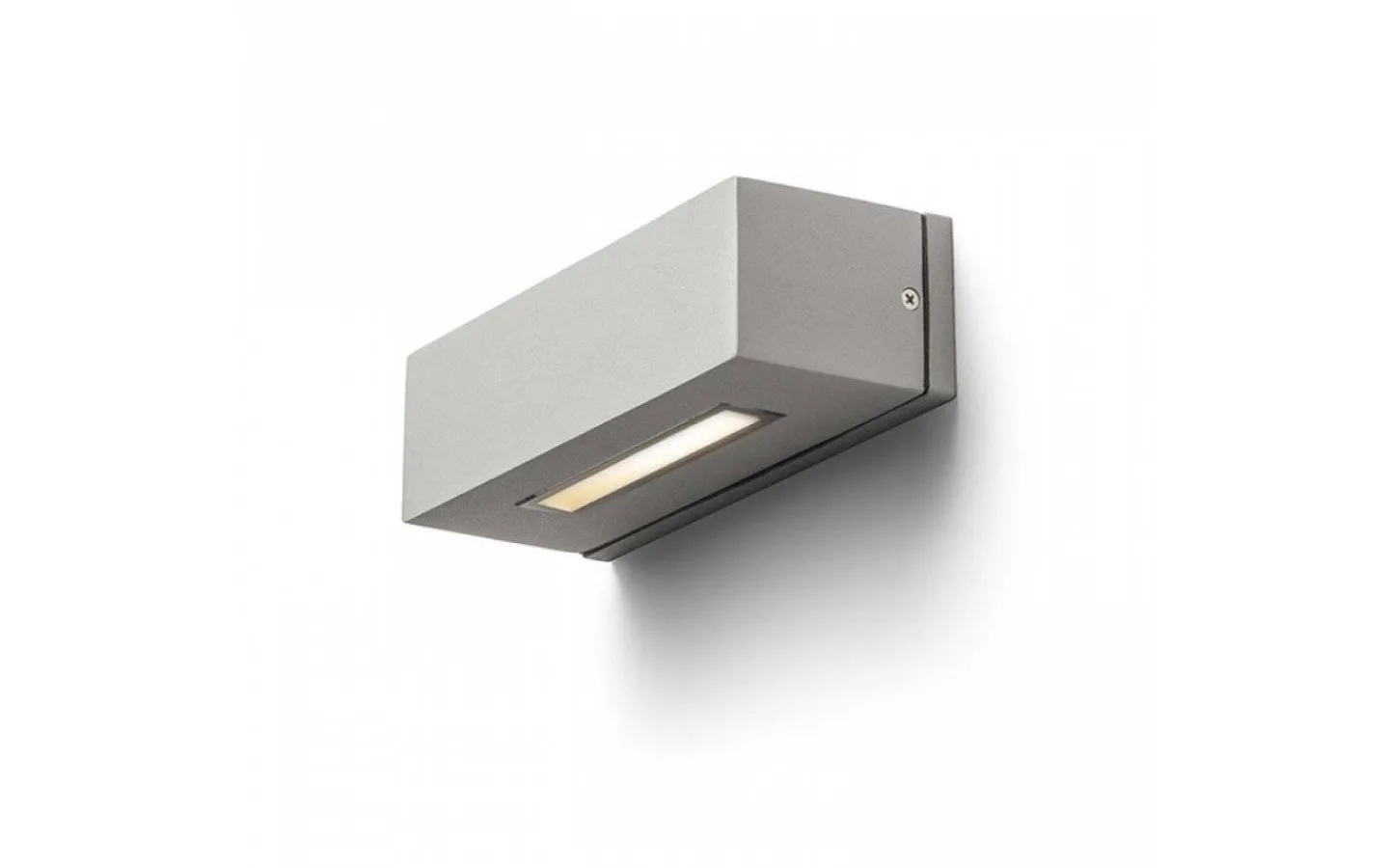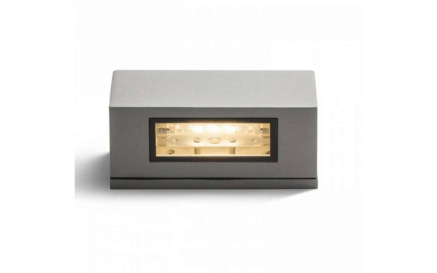 Dubbelriktad vägglampa för utomhusbruk. En sida av armaturen har en täcksiva av klarglas med svart ram. Den andra sidan har en täckskiva av frostat glas med svart ram.