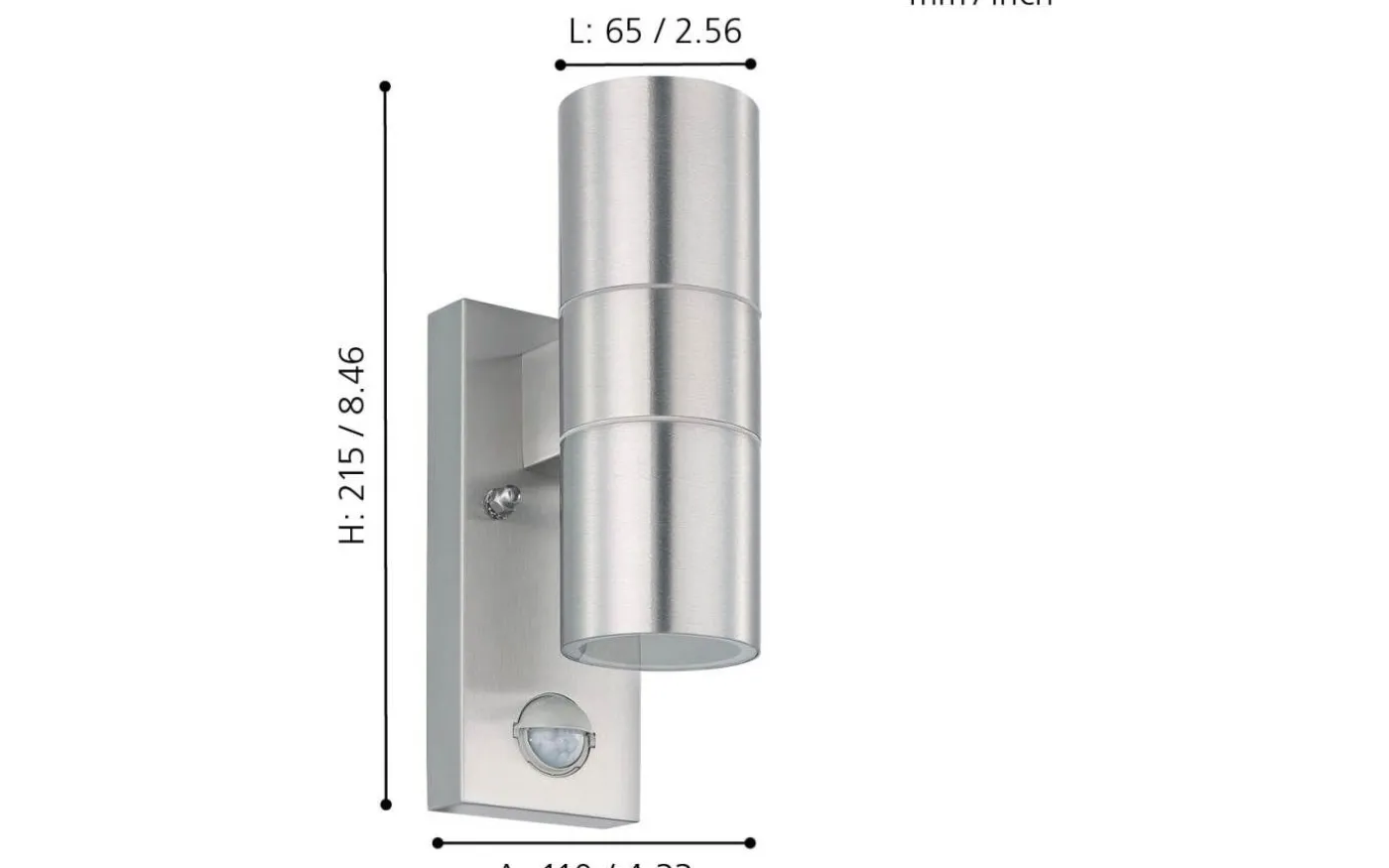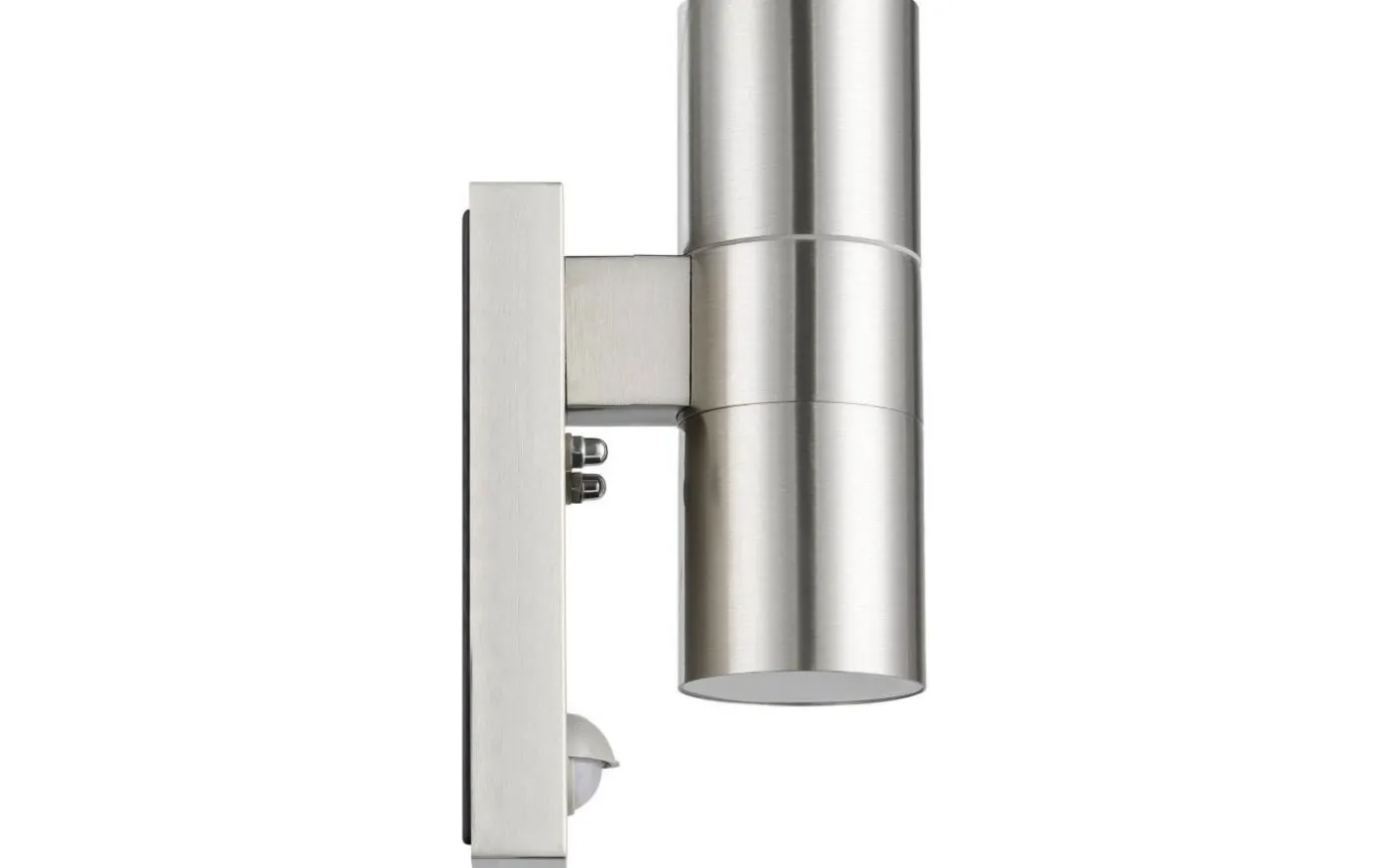RIGA 5 exteriör LED-vägglampa har en cylindrisk kropp i rostfritt stål med ett klart glasskydd i varje ände. Produkten innehåller GU10 LED-glödlampor, som ger ett behagligt varmvitt ljus. Den yttre vägglampan har en integrerad rörelsesensor som tänds automatiskt, lyser upp områden med dålig sikt och avskräcker oönskade besökare. Den integrerade skymningssensorn mäter omgivande ljusnivå för att säkerställa att ljuset bara tänds när det behövs. Produkten är lämplig för utomhusbruk på grund av dess IP44-skydd mot sprutvatten. Med sin moderna upp- och nerdesign smälter ljuset in i nästan alla utomhusområden och ger stilren indirekt belysning för ytterväggar.