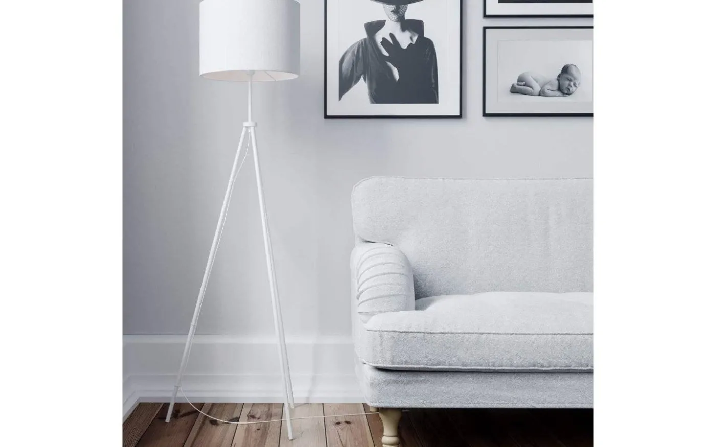 Fina golvlampan Rina, från välkända By Rydéns, är en modern golvlampa med stativ i vitlackerad metall och vit textilskärm. De tre benen gör att golvlampan står stabilt och avger ett modernt intryck.