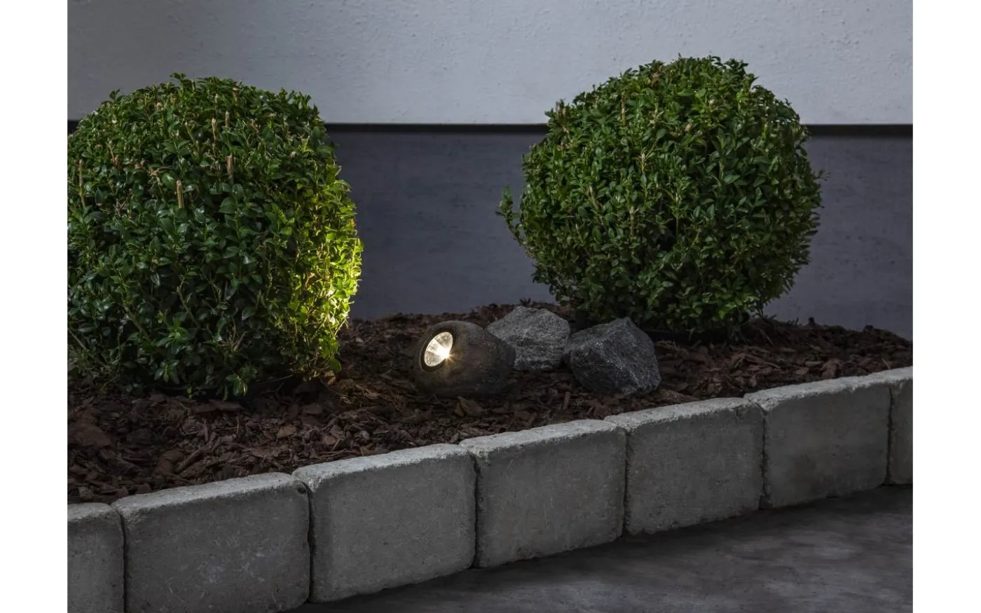 Solcellsdriven belysning i form av en sten som gör att den är enkel att placera i trädgården. Lyser upp med 15 Lumen under natten.