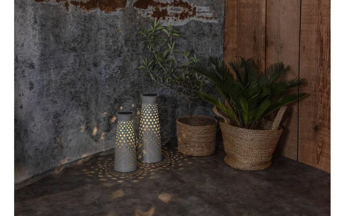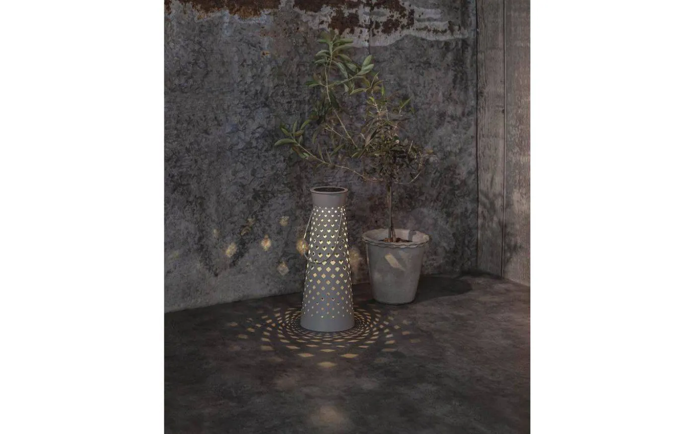 Romby solcellslampa från Star Trading är en snygg solcellslykta gjord i grå metall. Det varmvita ljuset lyser vackert genom det stansade rombmönstret och bildar en vacker ljusbild.