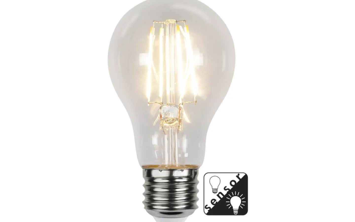 LED-lampa med E27-sockel, klart glas och färgtemperaturen är 2700K. Med inbyggd ljussensor tänds denna lampa automatiskt när det blir mörkt och släcks igen när det blir ljust.