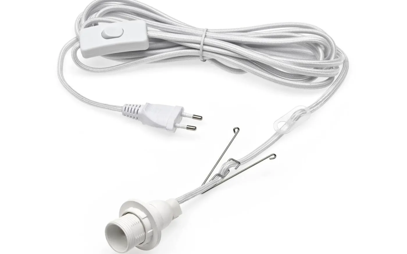 Vitt sladdställ med textilkabel från Konstsmide. Sladdstället är 5m lång och har en E14 lamphållare. Sladdstället har strömbrytare och stickkontakt för vägguttag.