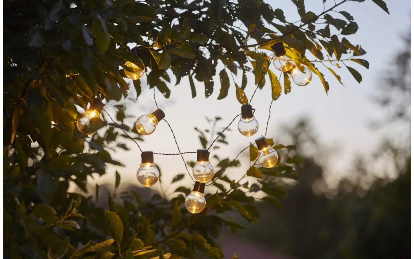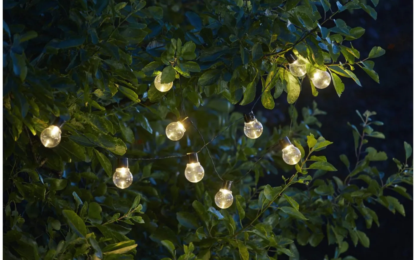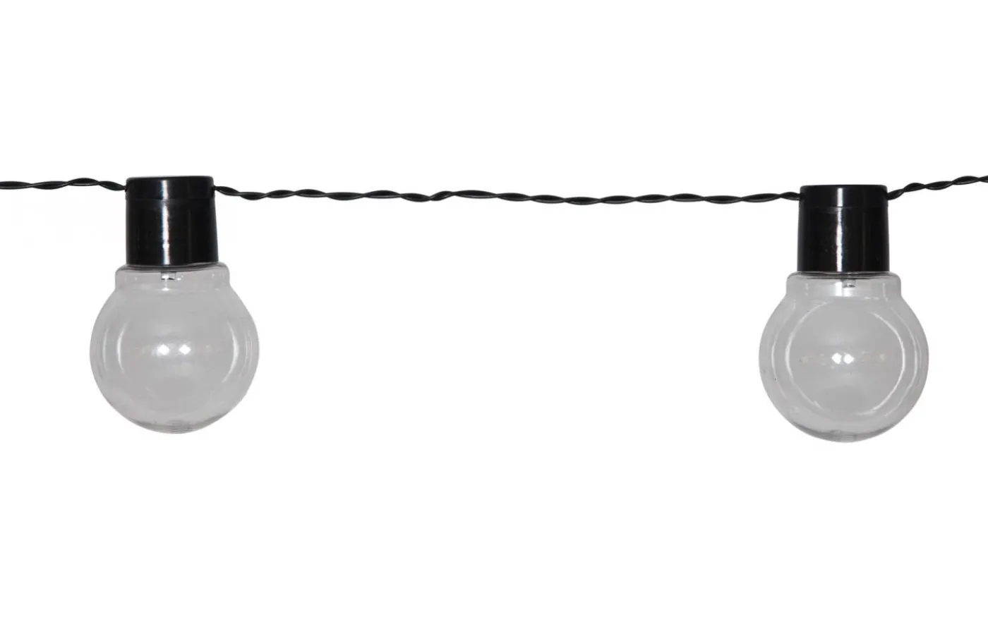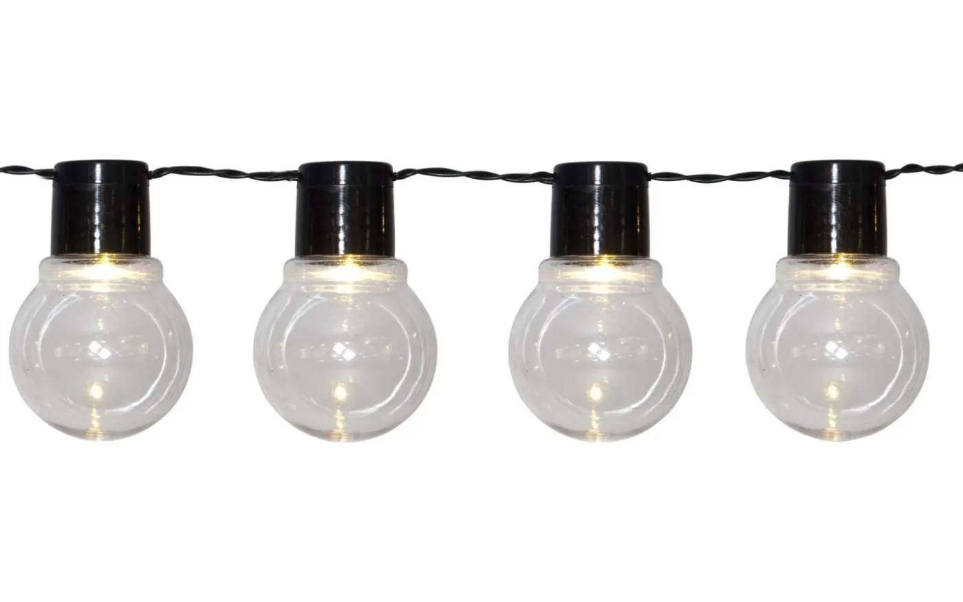 Solcellsslinga med 10st transparenta glober som lyser med varmvitt sken i mörkret. Fin att använda i trädgården eller på balkongen.