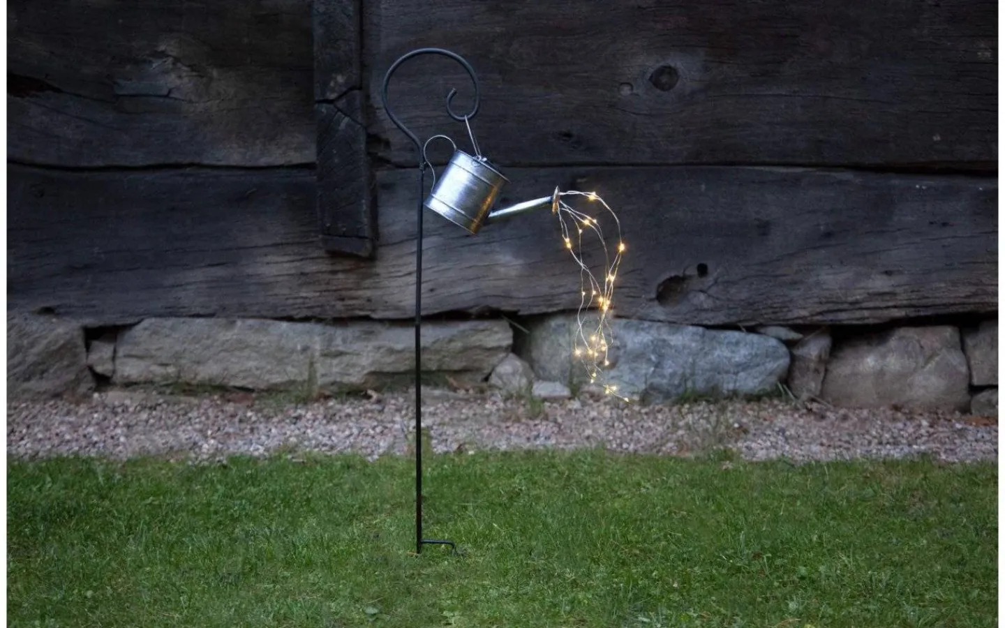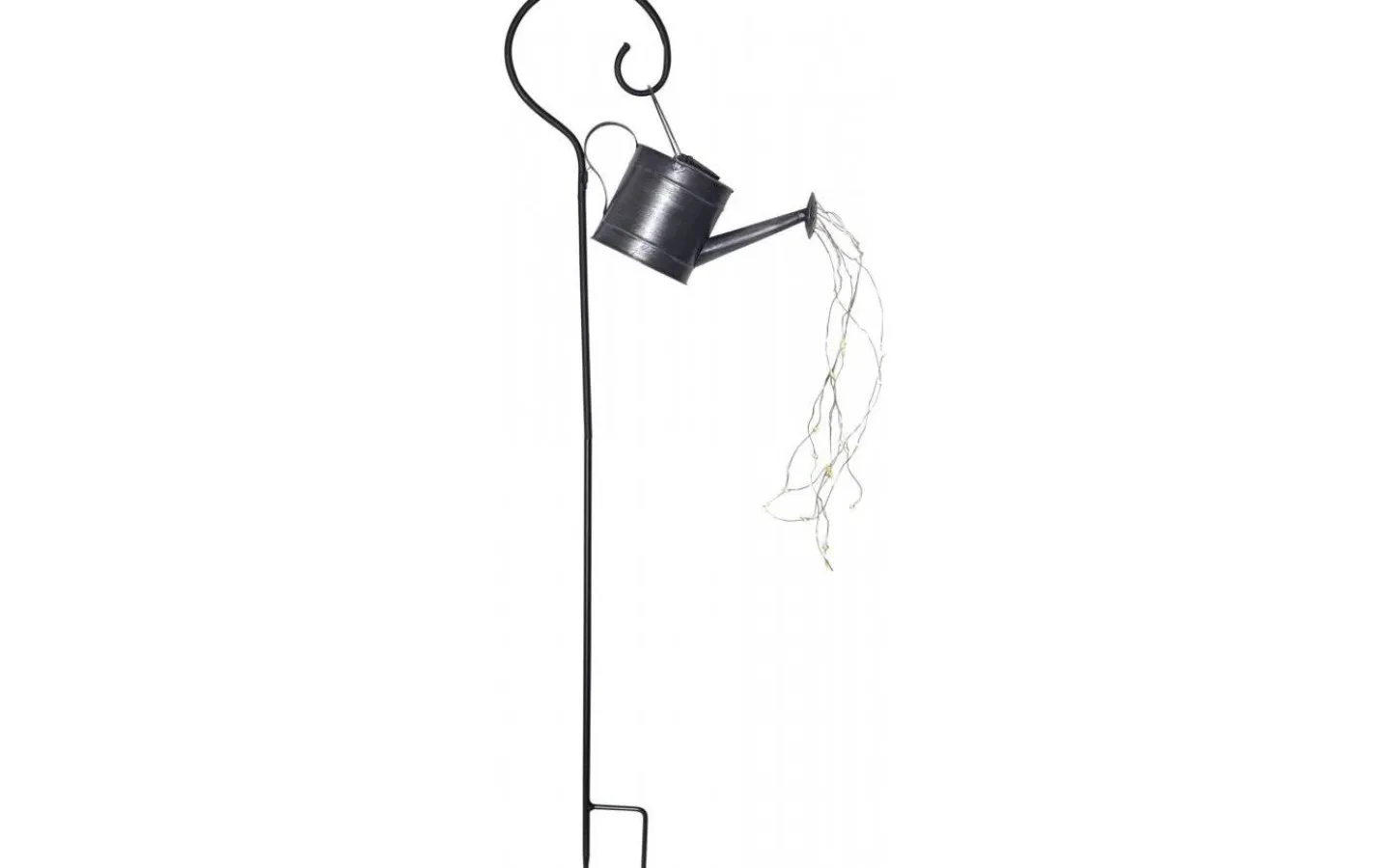 Dekorativ solcellslampa i form av en vattenkanna i zink på pinne. Som rinnande vatten ur vattenkannan, hänger fina ljusslingor med små LED-lampor som avger ett mysigt ljussken under mörker. Tryck ner pinnen i jorden och dekorera dina rabatter eller en större blomkruka med denna härliga solcellslampa och få en mysig dekorationsbelysning i din trädgård!