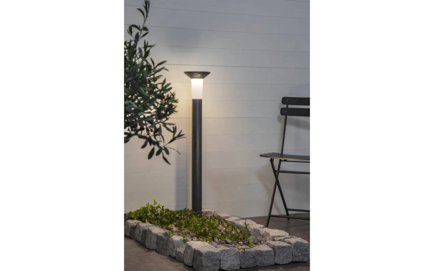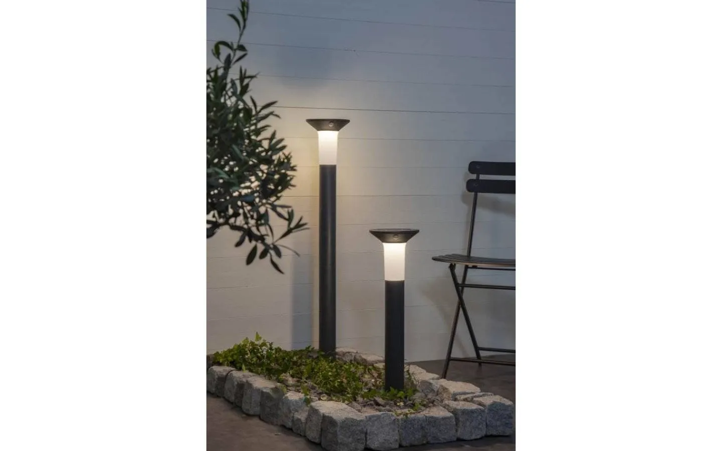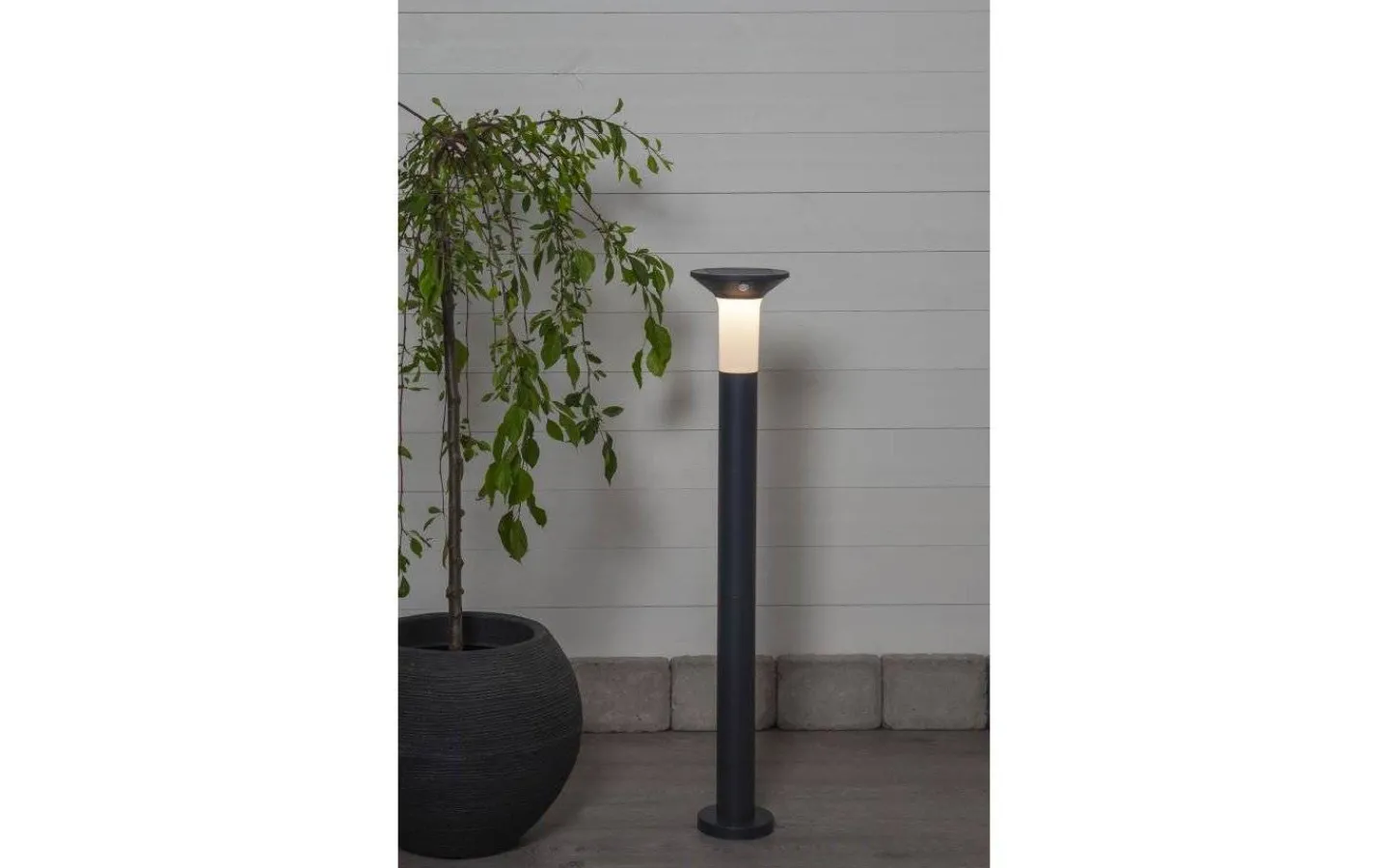 Valta Solcellslampa, från välkända Star Trading, är en stilren pollare som är i färgen grafit. Valta har inte bara en snygg design utan har flera olika funktioner. Du kan själv justera höjden och då välja mellan antingen 55 eller 90cm. Valta har även en inbyggd rörelsesensor samt ljusrelä. Vid skymning tänds solcellslampan automatiskt och lyser då i ett svagt varmvitt sken (15 lumen) men när sensorn känner av rörelse lyser den upp i ett mycket starkare ljussken (400 lumen) i 30 sekunder för att sedan återgå till det svagare ljusskenet. Dessa funktioner gör Valta till en perfekt solcellslampa att placera vid uppfarten eller vid en ytterdörr.