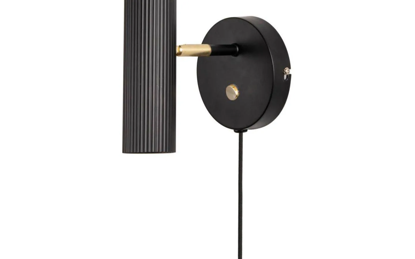 Stilrena vägglampan Hubble, från välkända Globen Lighting, är en läslampa i metall med en mattsvart finish och detaljer i mässing. Det smala lamphuvudet, med en räfflad look, är riktbart vilket gör att denna vägglampa passar perfekt som läslampa intill sängen.