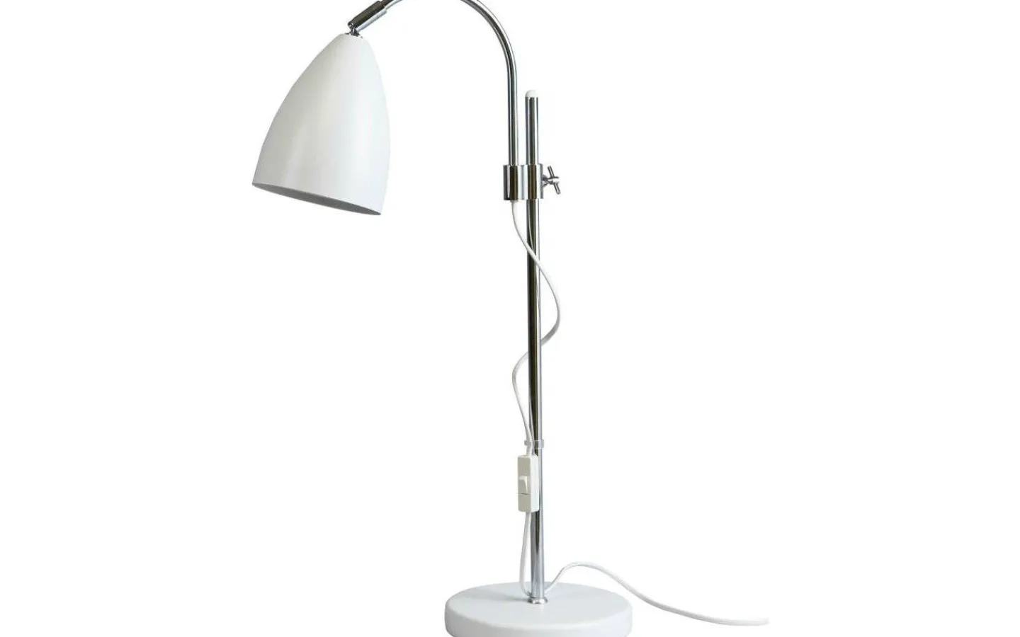 Sway bordslampa har en stomme och lamphuvud i mattvit metall kombinerat med ett stativ och detaljer i blank krom. Lamphuvudets placering justerar du själv då det går att höja och sänka, samt att du kan rikta lamphuvudet efter eget önskemål – allt för att du ska få det optimala läsljuset! Sladden som slingrar sig runt stativet är en modern detalj och på denna är även strömbrytaren placerad, så att du lätt kan komma åt och tända/släcka.
