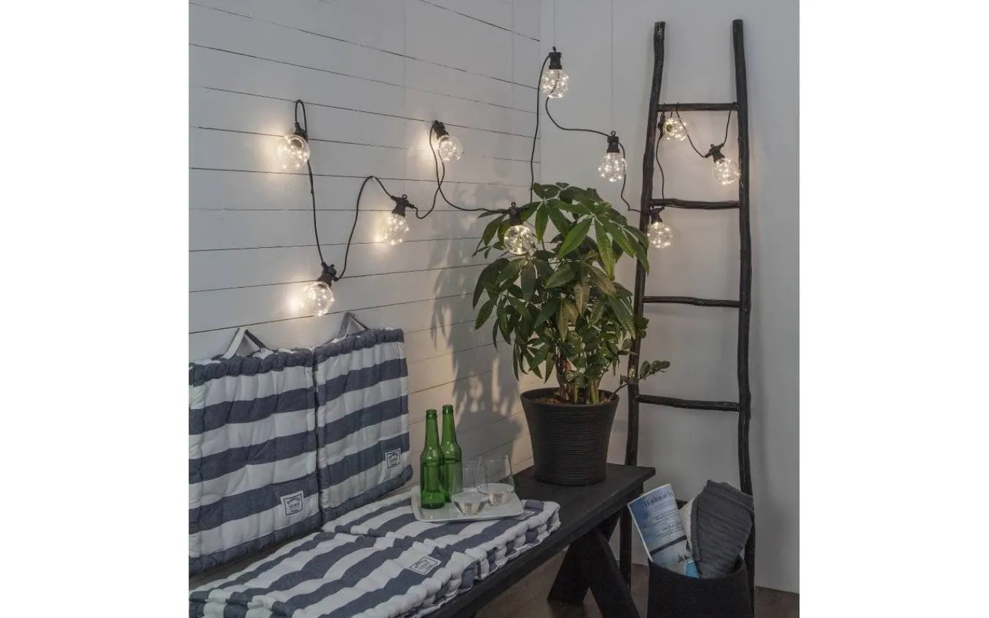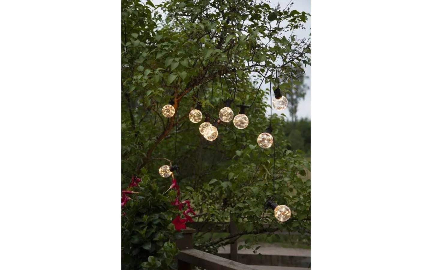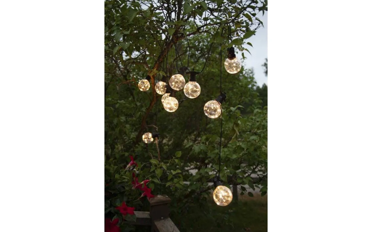 Ljusslingan är 4,5 meter lång med 50 cm mellan varje lampa och levereras komplett med en anslutningskabel på 5 meter med transformator och stickkontakt för vägguttag.