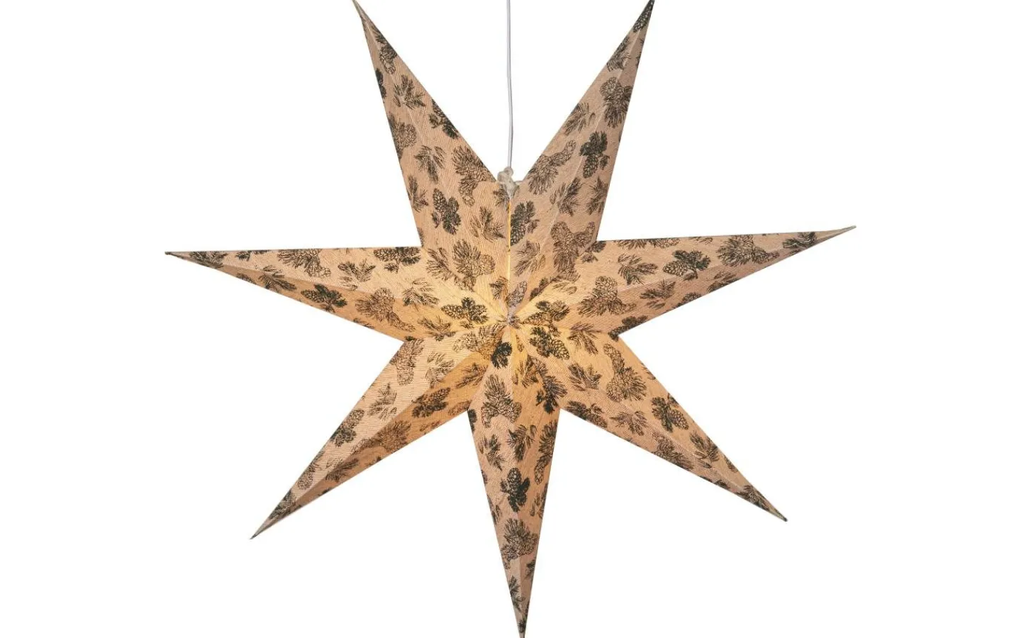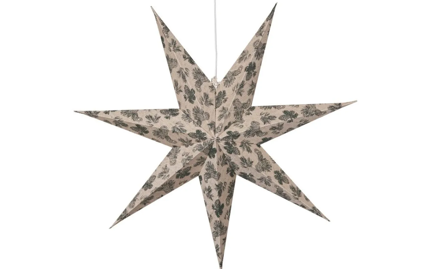 Pappstjärna klädd i bomullstyg med ett fint vintrigt grönt mönster av kottar och granbarr.