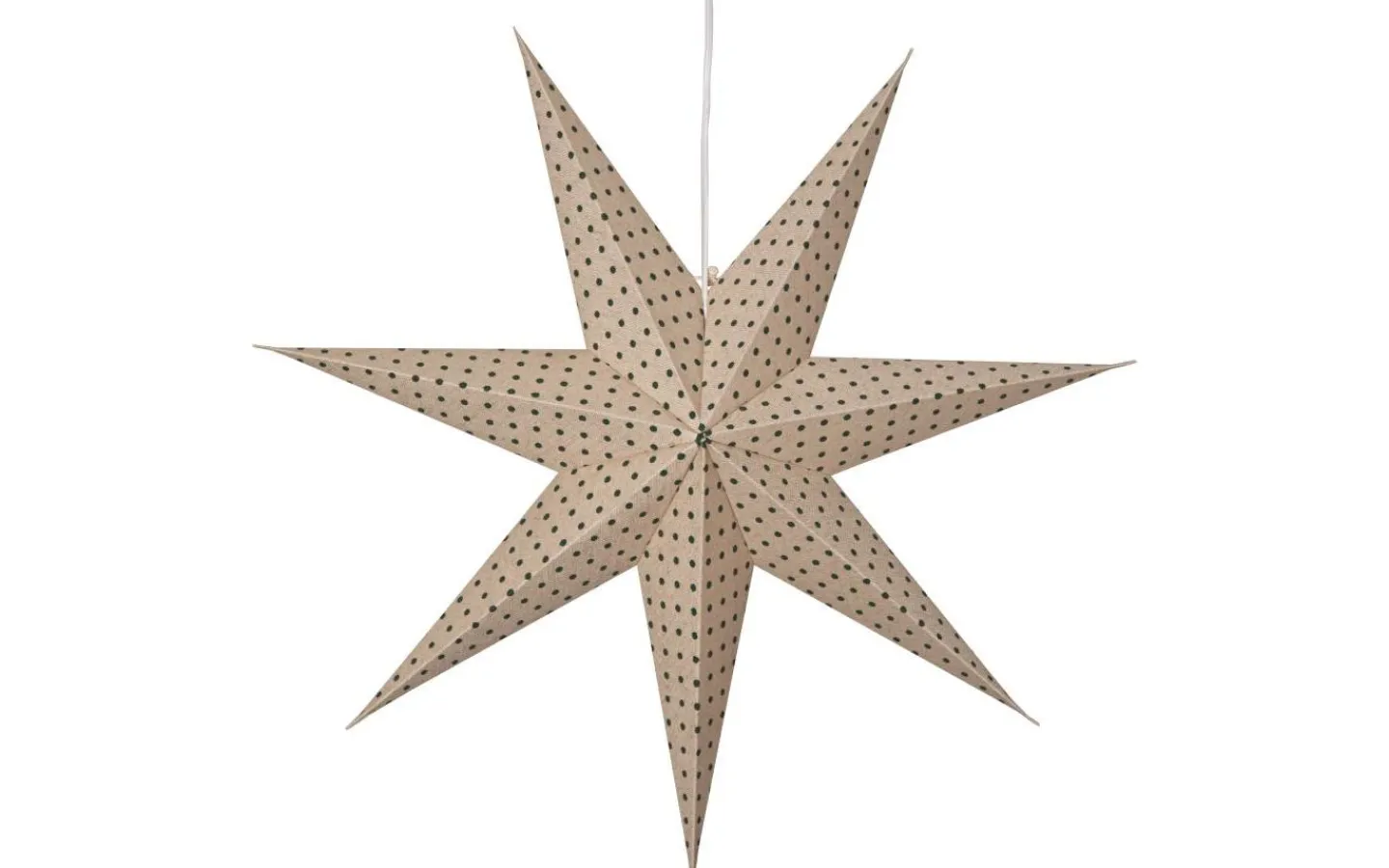 Pappstjärna klädd i bomullstyg med ett mönster av massa gröna prickar.