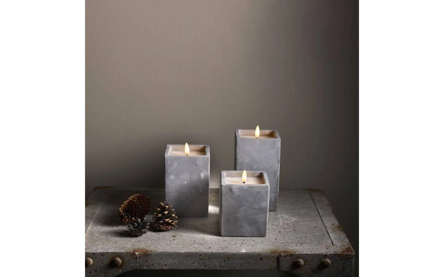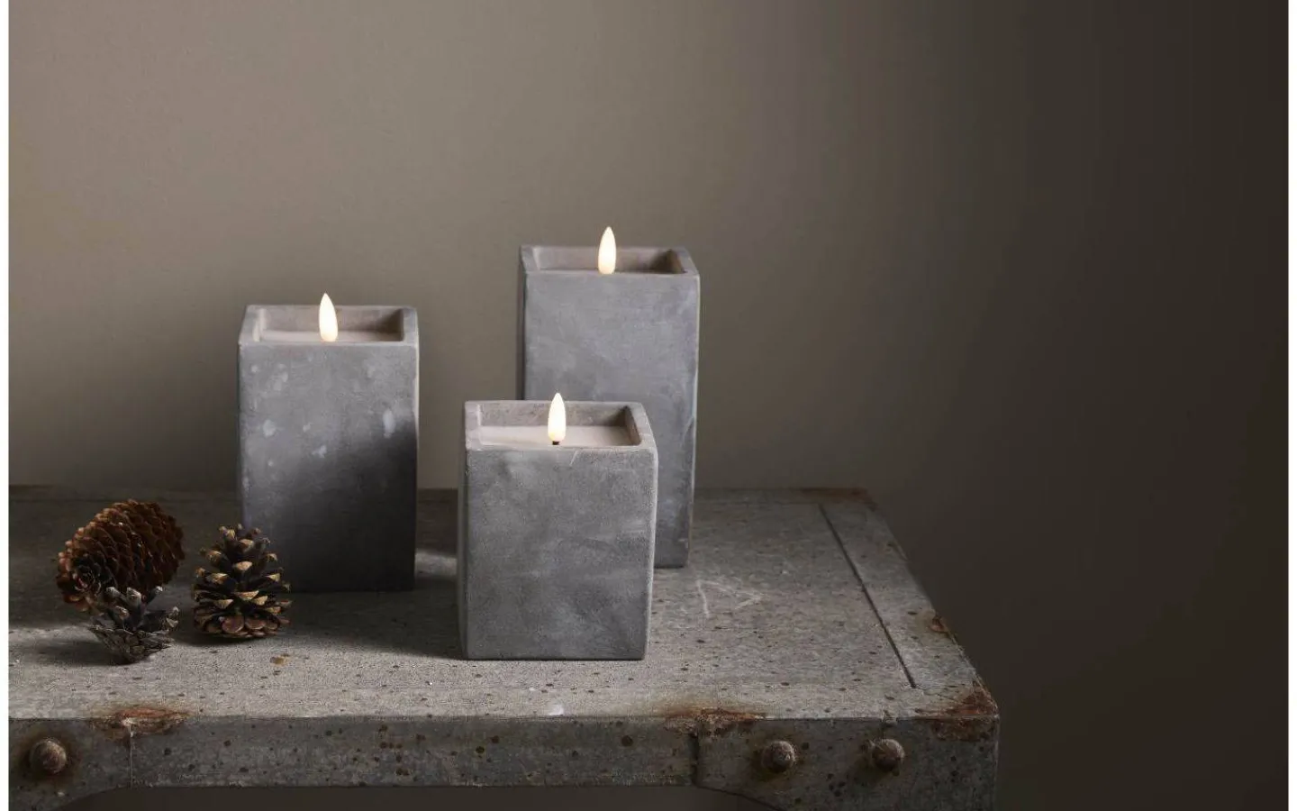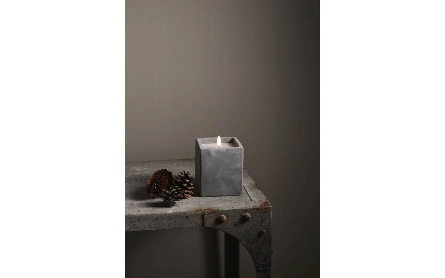 Flamme Cem batteridrivet blockljus från Star Trading är ett fyrkantigt ljus format av cement och fylld med vax. Ljuset har en svart veke med rund 3D-låga som lyser i ett mysigt varmvitt ljussken. Lågan skiftar i ljusstyrka för att avge ett vackert och verklighetstroget intryck.