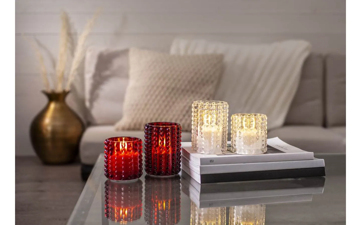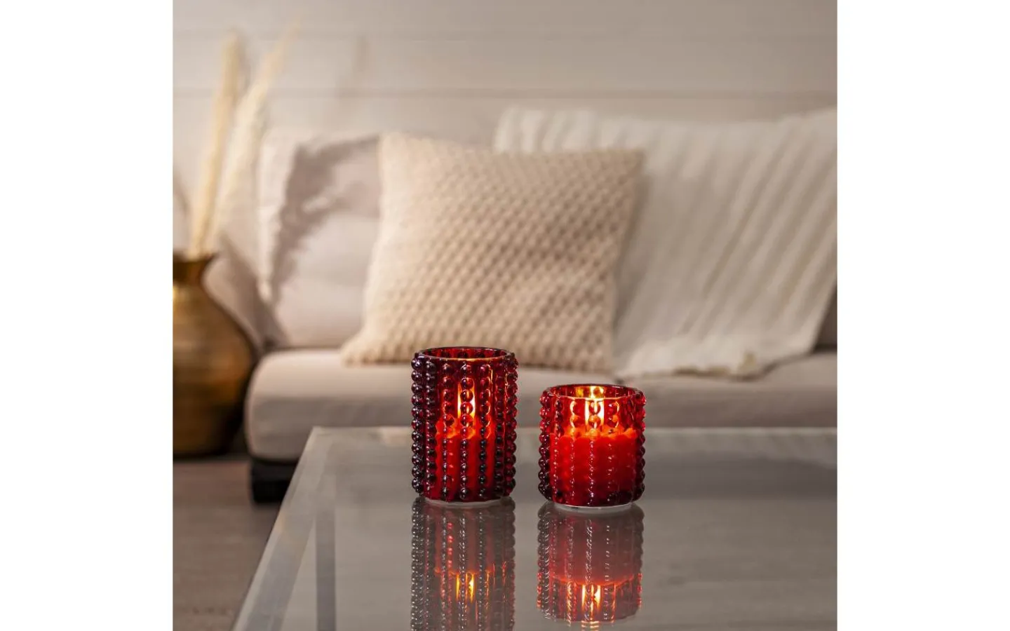 Flamme Dotty ljuslykta från Star Trading har ett rött glashölje med prickmönster runt vaxljuset. Detta ljus blir en vacker dekoration, både ensam som i grupp ihop med övriga ljus från vår Flamme serie.