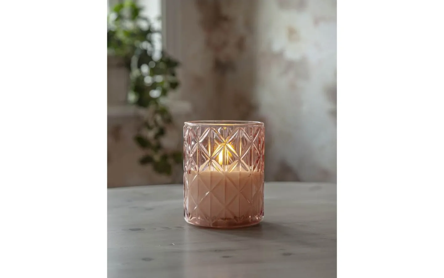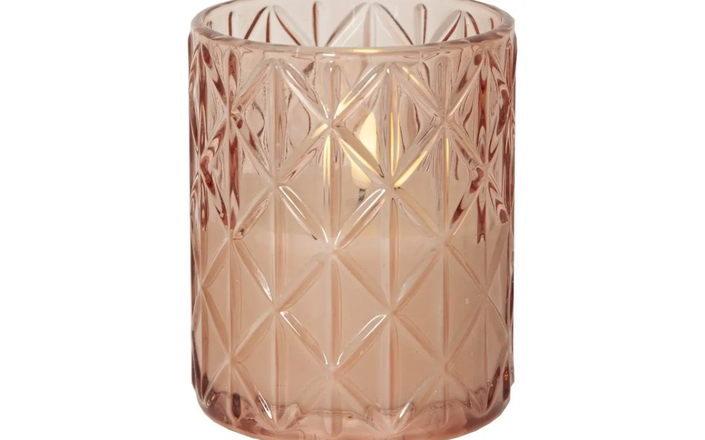 Flamme Romb i varmrosa ton på glaset med rombformat mönster och vaxljus inuti. Ljuset är cirka 10 x 12,5cm. Detta elektriska ljus blir en vacker dekoration, både ensam och i grupp ihop med övriga ljus från vår Flamme serie. Den har timerfunktion och när brytaren är på timerläget lyser ljuset i ca 30 dagar med en vacker realistisk låga i varmvitt. Den drivs av 2 AA batterier, dessa ingår ej. 2 batterier AA ingår ej. Batteritid ca. 200h.