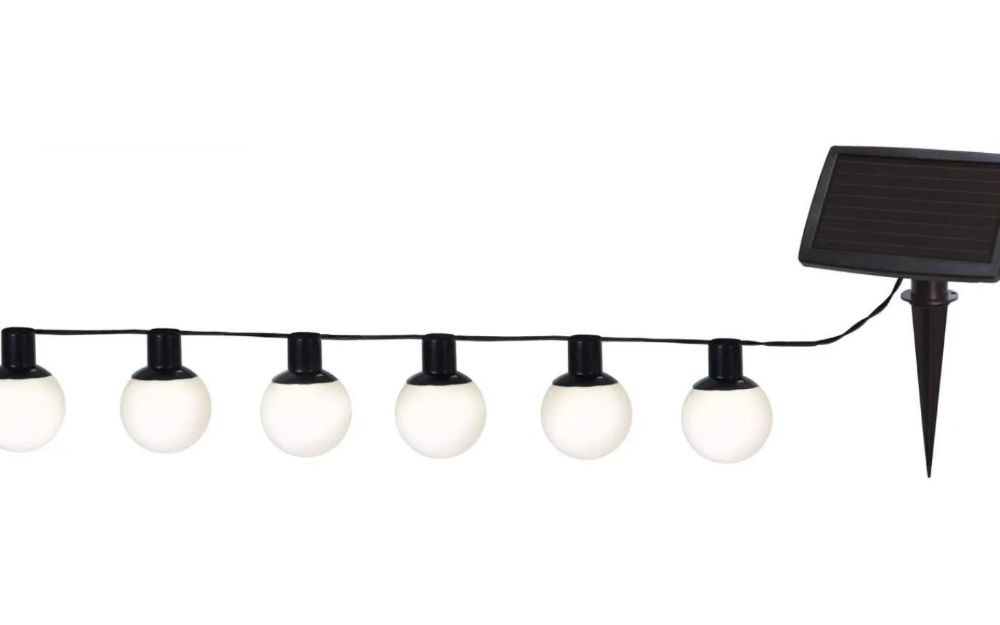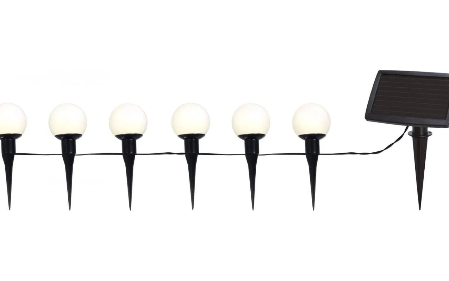 Globus ljusslinga är 5 meter lång med 30 cm mellan varje klot. Solcellen har en 2 meter lång sladd samt medföljande markspett.