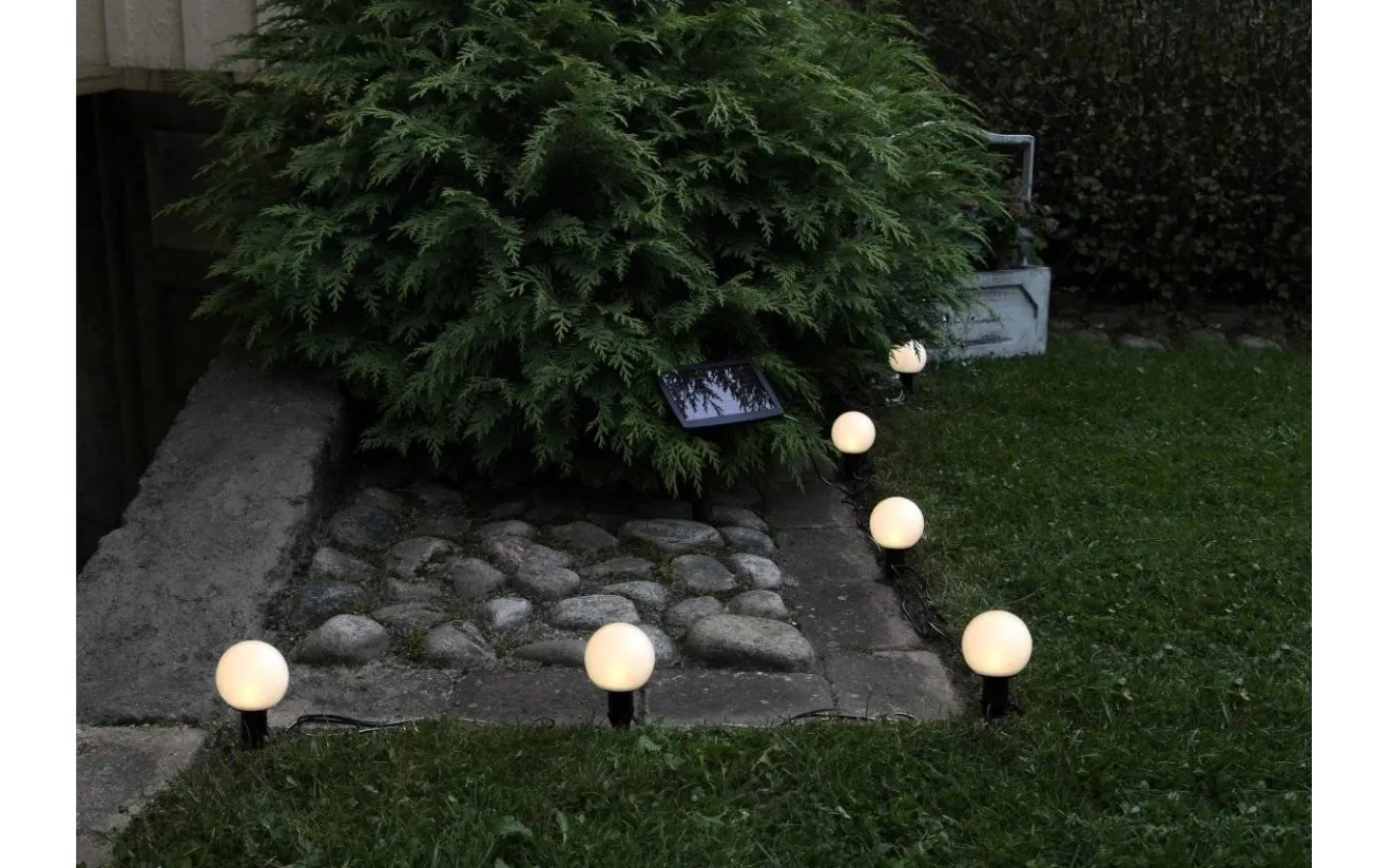 Denna modell av Globus är en solcellsdriven ljusslinga med 6 st vita miniklot, med 2 i 1 funktion. Välj om du vill använda slingan som en ljusslinga och linda den exempelvis runt ett balkongräcke, eller använd de medföljande markspetten och placera ut kloten på marken längs en blomsterrabatt.