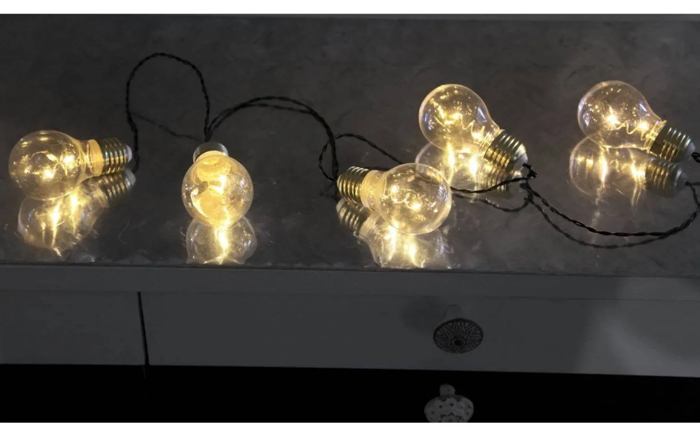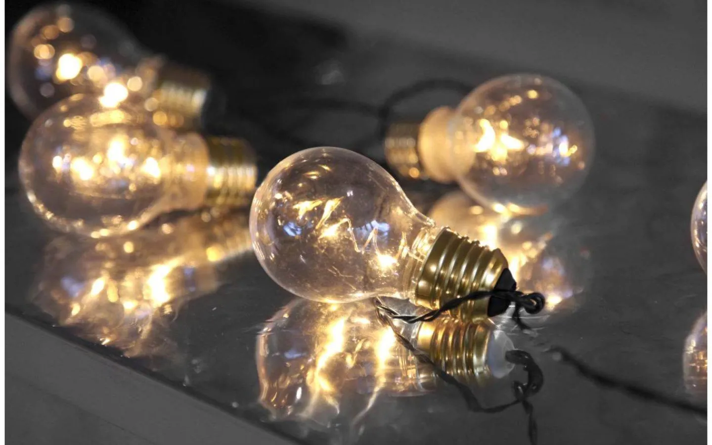 Ljusslinga med 5st Glowljus. Den vackra LEDljustråden har ett glashölje i glas fomat som en glödlampa med en mässingsfärgad sockel. Slingan har inbyggd timer och drivs med 3st AA-batterier, dessa medföljer ej.