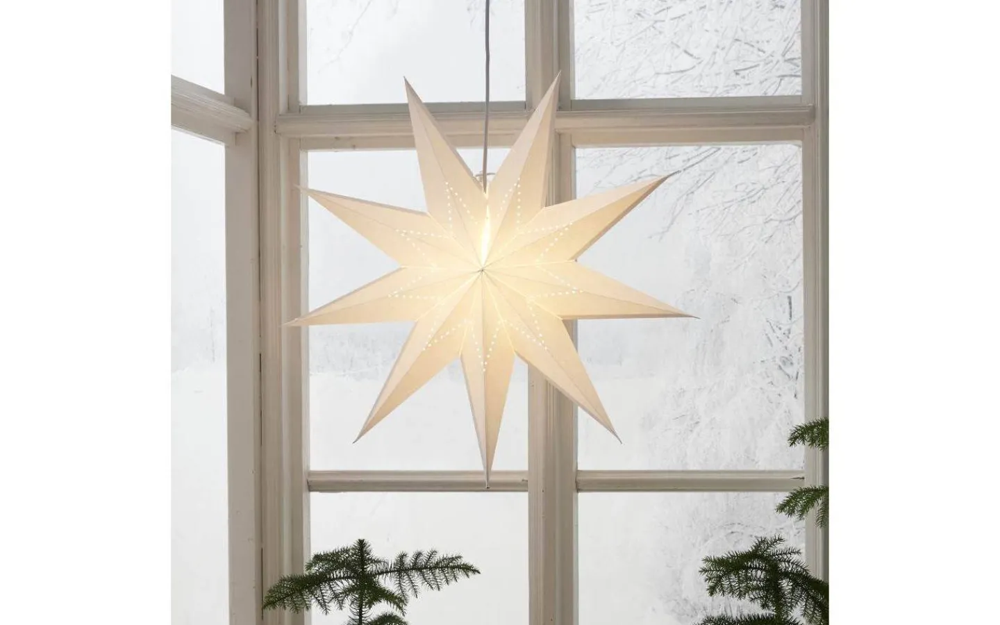 Vit pappersstjärna med hålmönster i form av en stjärna. Dekorera med till jul och advent. Häng en eller flera stjärnor tillsammans i ett fönster eller mot en vägg. Stjärnan har plats för en ljuskälla och det följer med ett upphäng för E14 lampa. Denna produkt har FSC®-märkning.
